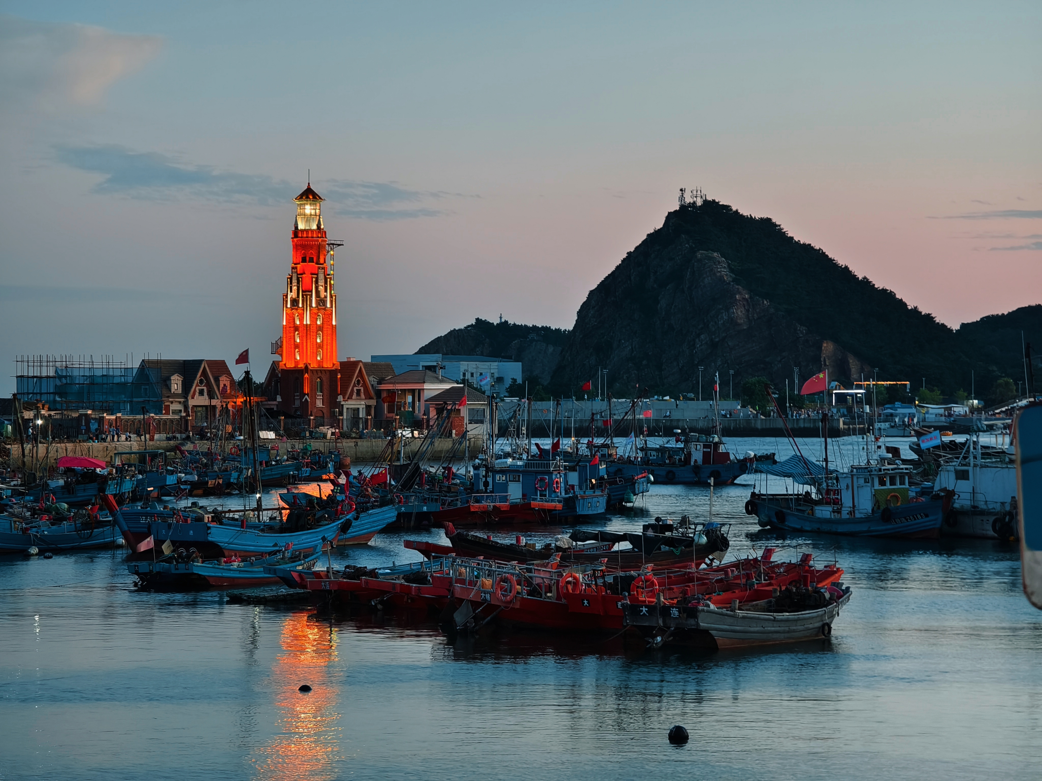 这天晚上难得赶上了蓝调时间,正好灯塔开灯 拍到了这张仿佛明信片的照片,这个渔人码头还在使用中,很多渔船在这里停泊。对面就是老虎滩,很多游客都会来这里拍照打卡。赶上退大潮还可以赶海。