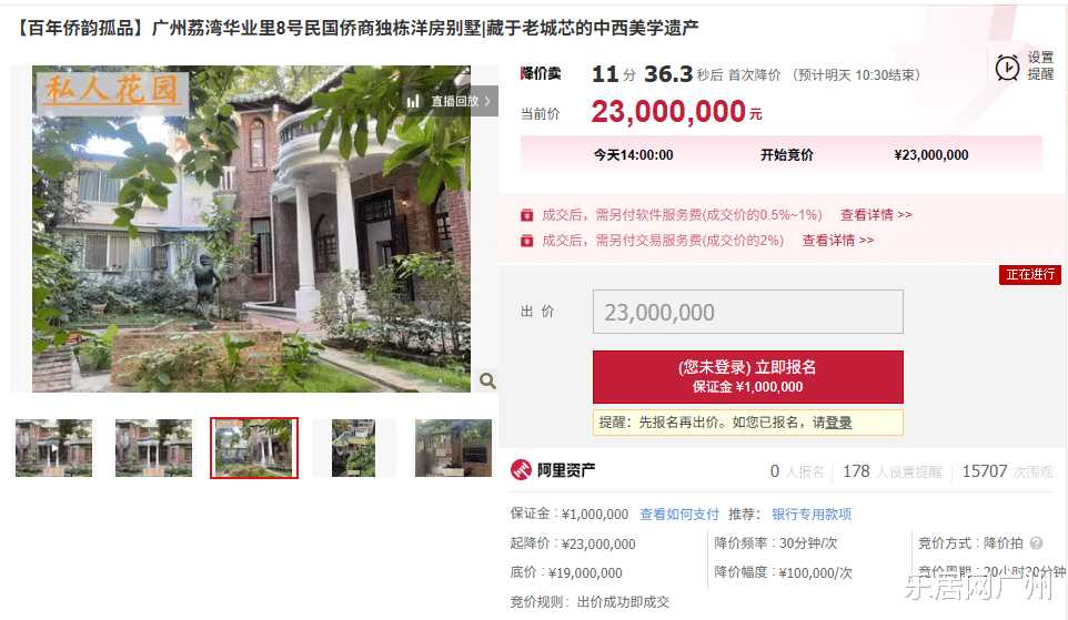 图源阿里法拍二来,买家需承担过户的增值税、土地增值税、契税等一系列税费,这种文物税费不会低;三来,别墅处于荔湾闹市,不适合注重隐私+喜欢清净+看重城市景观的人。如果没人出价,预计明天早上10:30拍卖就会结束,等待时机回炉再造。大家觉得,这套房子会顺利拍出吗?