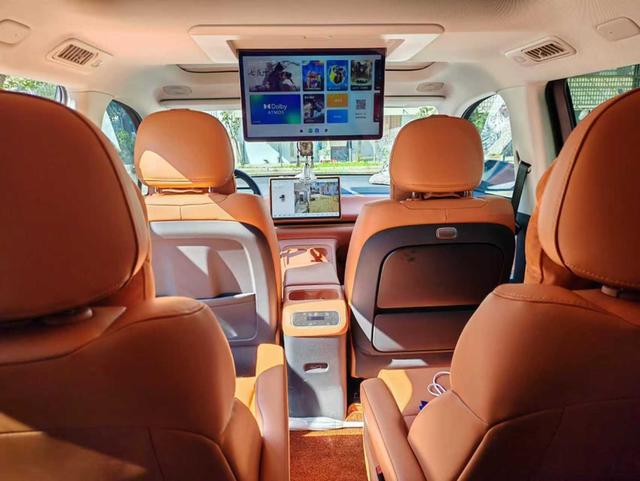 车顶是分段式全景天窗,中间有一块15.6英寸吸顶屏,长途出行的时候,后排孩子能看动画片,缓解旅途枯燥。音响系统也给力,车内有21个扬声器,7.1.4声道布局,声场效果不错,前后排都能有好的听觉体验。加上全车隔音玻璃,噪音控制得很好,车速到100km/h的时候,车内噪音62分贝,风噪、胎噪都不明显,跟家人聊天不用再提高音量。