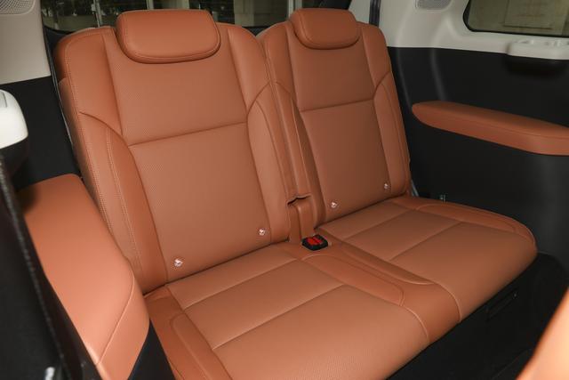 第二排是两个独立座椅,扶手能旋转调节,胳膊搭上去很舒服。就算给第三排留了基本乘坐空间,我坐第二排腿部还有一拳半的余量;要是把第二排座椅往后挪挪,腿部空间能到两拳以上,这个表现挺不错。重点说第三排,实际体验超出预期,我坐进去腿部还有一拳距离,头部空间因为溜背设计,比前两排小一点点,但也够用,身高180cm的朋友坐进去也没顶头,长时间坐下来不算难受。