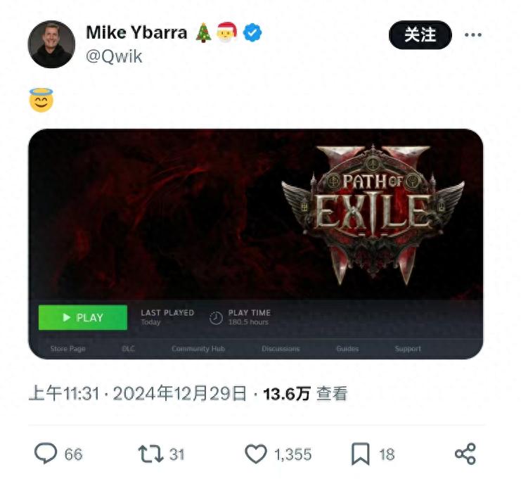事情是这样的,就在几天前,这位曾经在微软、暴雪历任高管的老哥,在X平台发文晒出了自己的Steam游戏时长:《流放之路2》,180小时!