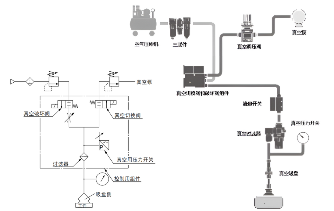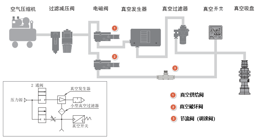 使用节流阀,使吸着和未吸着的真空压力变化减小。每个吸盘都配设真空切换阀,吸着失效时可通过切换以阻止对其它吸盘产生影响。真空泵系统还可利用真空罐及真空减压阀来稳定真空压力使用真空安全阀来限制真空度下降,从而使其他吸盘的真空度不受影响。真空系统其他注意点作为停电对策,供给阀应选用常开式或带自我保持功能的阀。工件的吸着和搬运,可用真空压力开关确认,吸吊重物及危险品时,应并用真空表进行目视确认。在恶劣环境下,压力开关前应加装真空过滤器,但是过滤器的孔眼阻塞,会影响吸着部分和真空发生器部形成压力差,造成是否真正吸着判断错误,这个必须注意。与压力较高的正压相比较,真空压更容易受到配管阻力等影响。尤其是真空到达时间受配管的内径和长度影响较大,因此配管时尽量选择容积较小的。