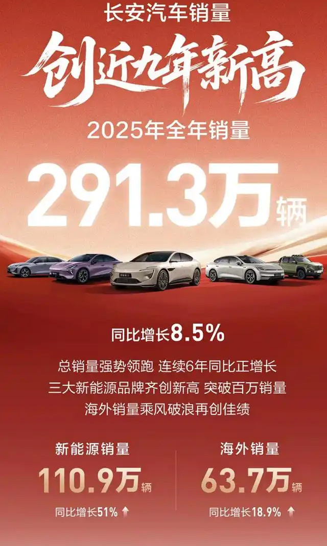 长安汽车2025年全年总销量超291万辆强势领跑,同比增长8.5%,创近9年新高。海外市场全年销量达63.7万辆,同比增长18.9%,创下历史新高,展现出强劲的全球化竞争力。