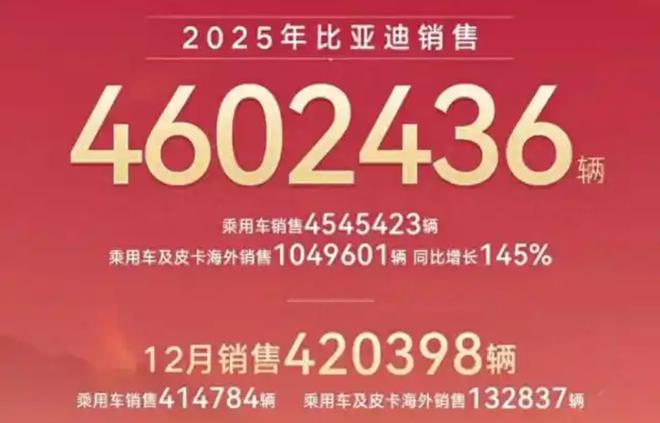 2025年,比亚迪全年销售460.24万辆,其中,乘用车销售4545423辆。乘用车及皮卡海外销售104.96万辆,同比增长145%。这是比亚迪首次海外出口销量突破100万辆,比亚迪刀片电池技术以及DM-i 混动技术的市场认可度和100%的新能源渗透率,契合海外市场需求,为其带来出口销量增长。