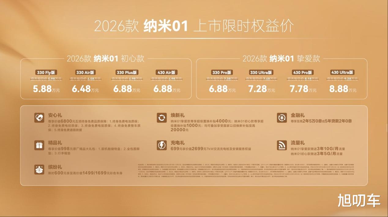 当价值远高于价格,是给予用户最大的诚意,也是纳米01面向市场最大的底气。新车特别推出「初心款」与「挚爱款」双版本共计8款车型,限时焕新指导价5.88-8.88万元,并且为用户准备了安心礼、金融礼、精品礼、缤纷礼等七重大礼。