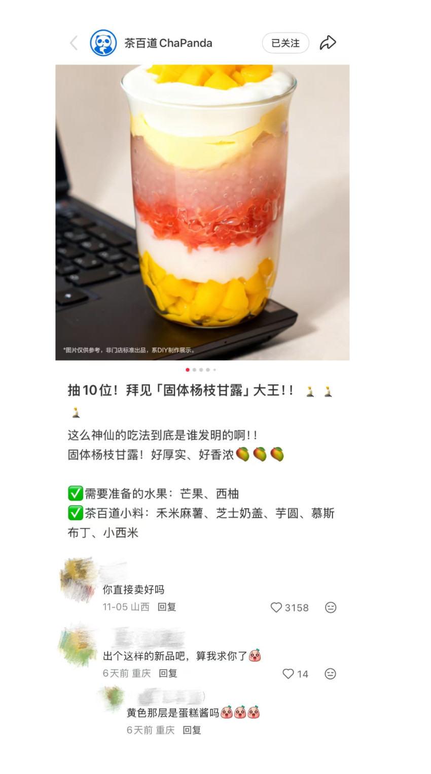 不少网友还去各大新茶饮品牌的评论区“请愿”,盼着能出“官方版”固体杨枝甘露。以茶百道为例,11月5日,品牌通过社交账号“官方接梗”,发布教程指导消费者用门店小料复刻这款甜品,评论区随即被“求上架”的声音刷屏,有网友留言:“别逼我求你,赶紧出个官方版!”