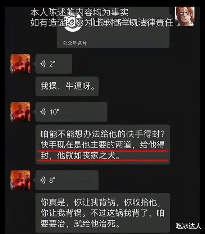 “打假网红”妖怪的爆料,为这起事件增添了更多扑朔迷离的色彩。据他透露,aka曾私下联系他,并提出了一个令人震惊的请求:想办法封禁帝师在某音的账号。妖怪的原话是:“aka曾私下联系我,并告知其目的:咱能不能想办法给他ks(某音)封了,ks现在是他主要的粮道,封了,就如丧家之犬。你让我背锅,你收拾他,你让我背锅……” 这段话信息量巨大,揭示了aka的险恶用心。他知道帝师的主要收入来源是某音,一旦账号被封,就等于断了他的财路,让他陷入绝境。而aka的计划,则是利用妖怪作为“枪手”,由妖怪出面打假,自己则躲在幕后操控,让妖怪背负所有的骂名和责任,自己坐收渔翁之利。这种借刀杀人的伎俩,令人不齿。