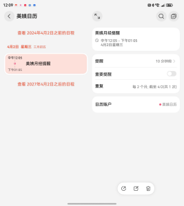 通过鸿蒙日历特性,美姨 App 实现经期前灵活提醒,还可以高度定制化重要消息提醒。肖世荣提到,不仅是经期日历,育儿日历备忘、学习课程表日历、工作日历等等,都可以和鸿蒙日历的提醒生态做结合,做功能创新尝试。