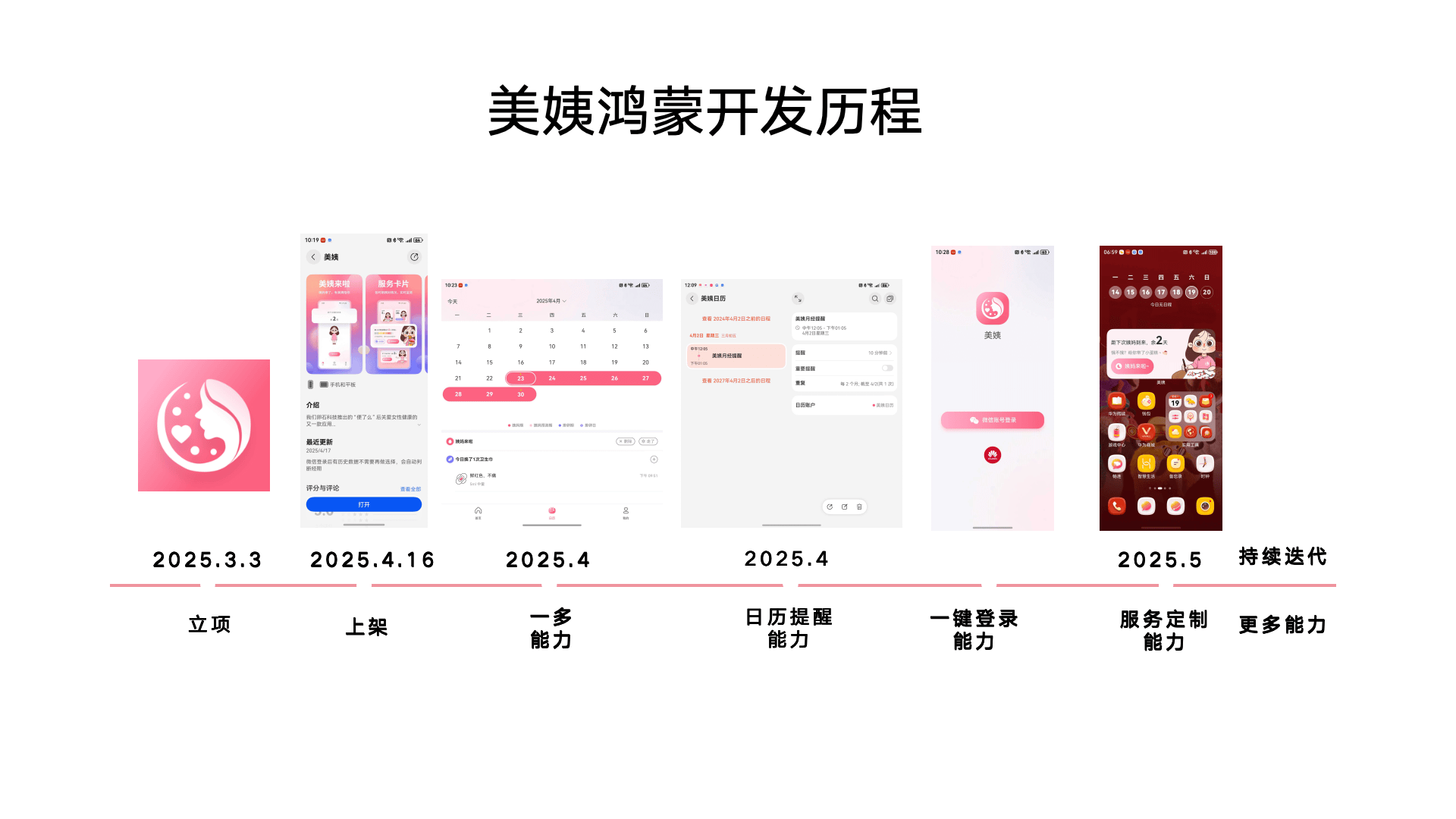 虽然便了么用户希望 App 增加经期功能,不过肖世荣认为过多新增功能和需求会把已有 App 变得臃肿,失去了它原本简洁和专注的特性,所以团队决定重新开发全新的应用。在开发平台选择上,肖世荣在前几款鸿蒙 App 开发中积累了丰富经验,团队经过慎重考虑,最终决定首选在鸿蒙平台上开发美姨 App。他表示:"我们评估了 iOS、安卓和鸿蒙三大平台,最终选择鸿蒙作为首发平台,主要基于以下几点考虑:鸿蒙的开发效率高,可以快速迭代;鸿蒙的分布式能力为未来美姨功能扩展提供了可能;鸿蒙对中小开发者的扶持政策非常给力。"