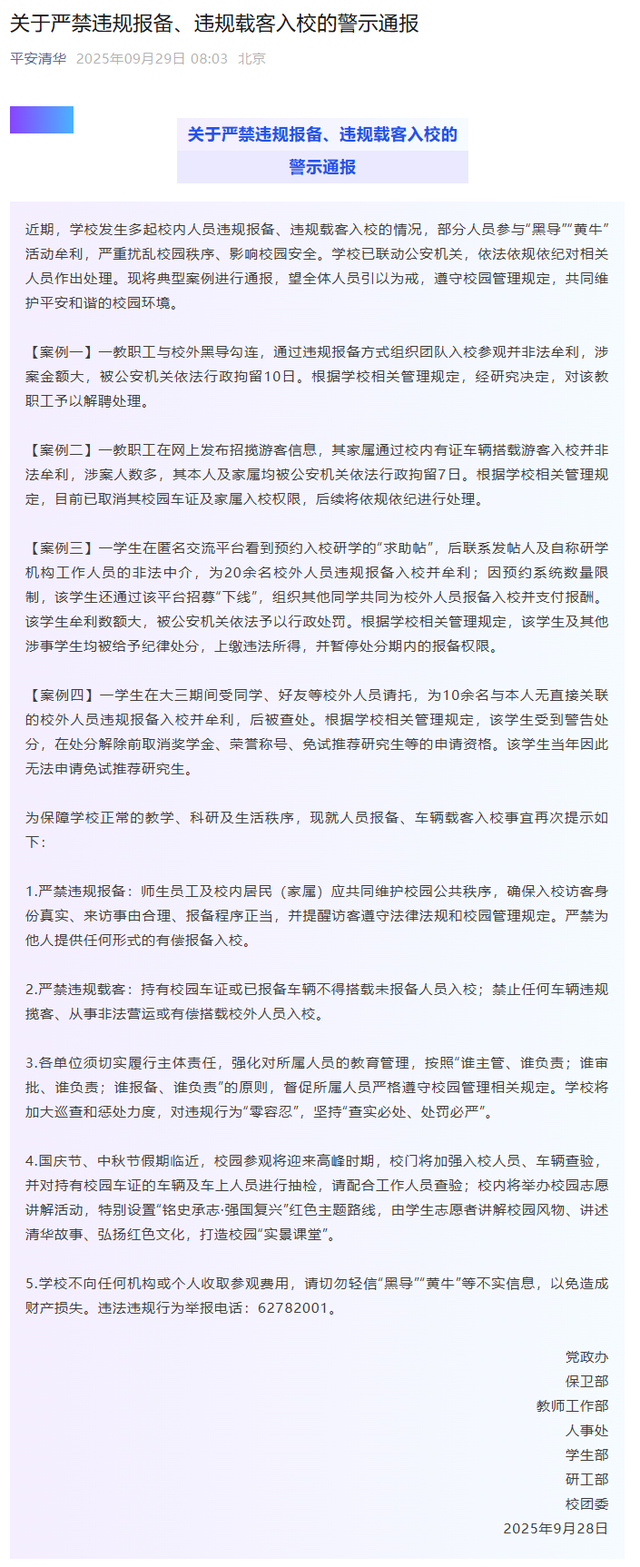 2025 年 9 月 28 日,清华大学通过 “平安清华” 公众号发布警示通报,曝光 4 起校内人员参与 “黑导”“黄牛” 活动的典型案例,引发社会对高校管理与开放边界的热议。