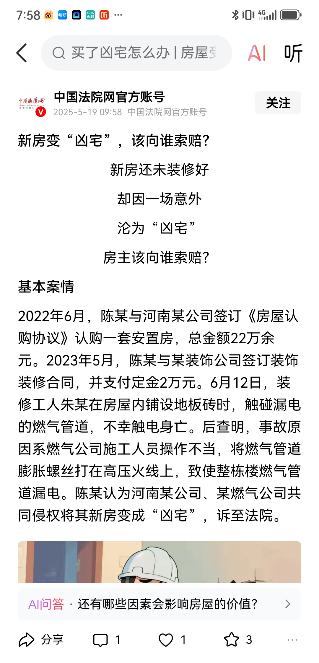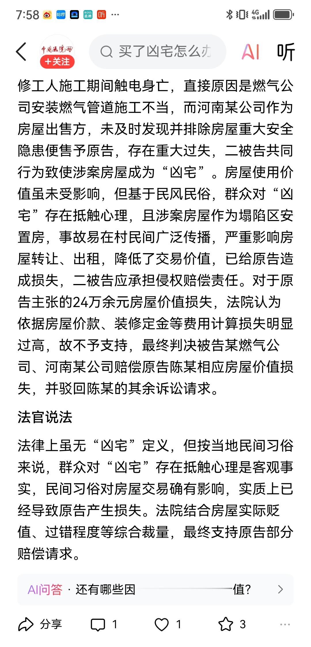 甚至,如果造成“凶宅”的,业主也可以要求肇事者根据实际情况酌情予以赔偿损失。比如:2022年6月,陈某与河南某公司签订《房屋认购协议》认购一套安置房,总金额22万余元。2023年5月,陈某与某装饰公司签订装饰装修合同,并支付定金2万元。6月12日,装修工人朱某在房屋内铺设地板砖时,触碰漏电的燃气管道,不幸触电身亡。后查明,事故原因系燃气公司施工人员操作不当,将燃气管道膨胀螺丝打在高压火线上,致使整栋楼燃气管道漏电。陈某认为河南某公司、某燃气公司共同侵权将其新房变成“凶宅”,诉至法院。