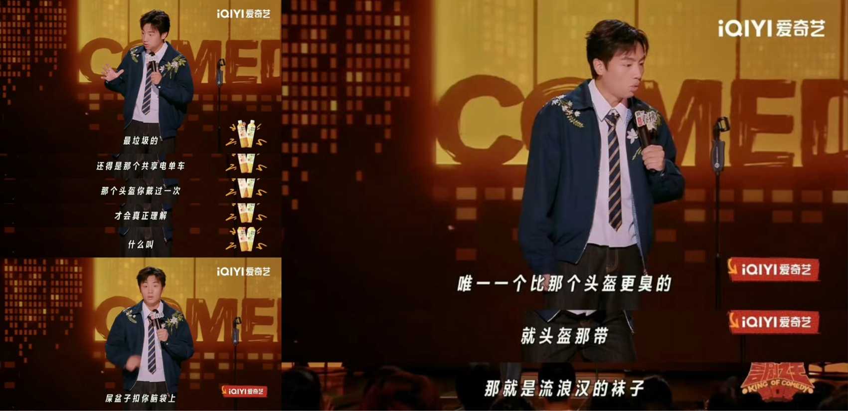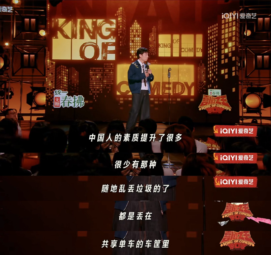 因为鑫博的观察实在是太生活、太接地气了,前脚刚说完很少有随地乱丢垃圾的了,后脚紧跟着一句:“都是丢在共享单车的车筐里”,这句一出引发全场爆笑。接着鑫博继续精准吐槽,有一次碰到车筐里有别人吃剩的半包辣条,他想把它扔到垃圾桶里,却被地铁口的电瓶车团团挡住了去路,“好在,电瓶车也有车筐”。这句话听懂的都知道里边的门道有多深!