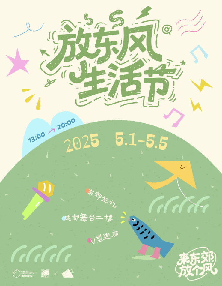 视野向上生长一寸,内心也就延展一里。5月1日至5日,东郊记忆宝藏空间——成都舞台二楼U型连廊化身“东风文化场域”,联合东郊记忆园区商户共创,提炼中国传统文化里「东风」意味着“春风”象征新生和希望的正向价值观,结合消费者渴望“放风”的内在情绪。以“放东风生活节”为主题, 以五大内容板块“逛、造、赏、借、集”为线索,33家特色市集、1场开幕特别活动、4大工作坊、20场音乐表演、5场流动艺术、2大艺术装置、主题周边,串联起传统文化与现代创意的共生实验。