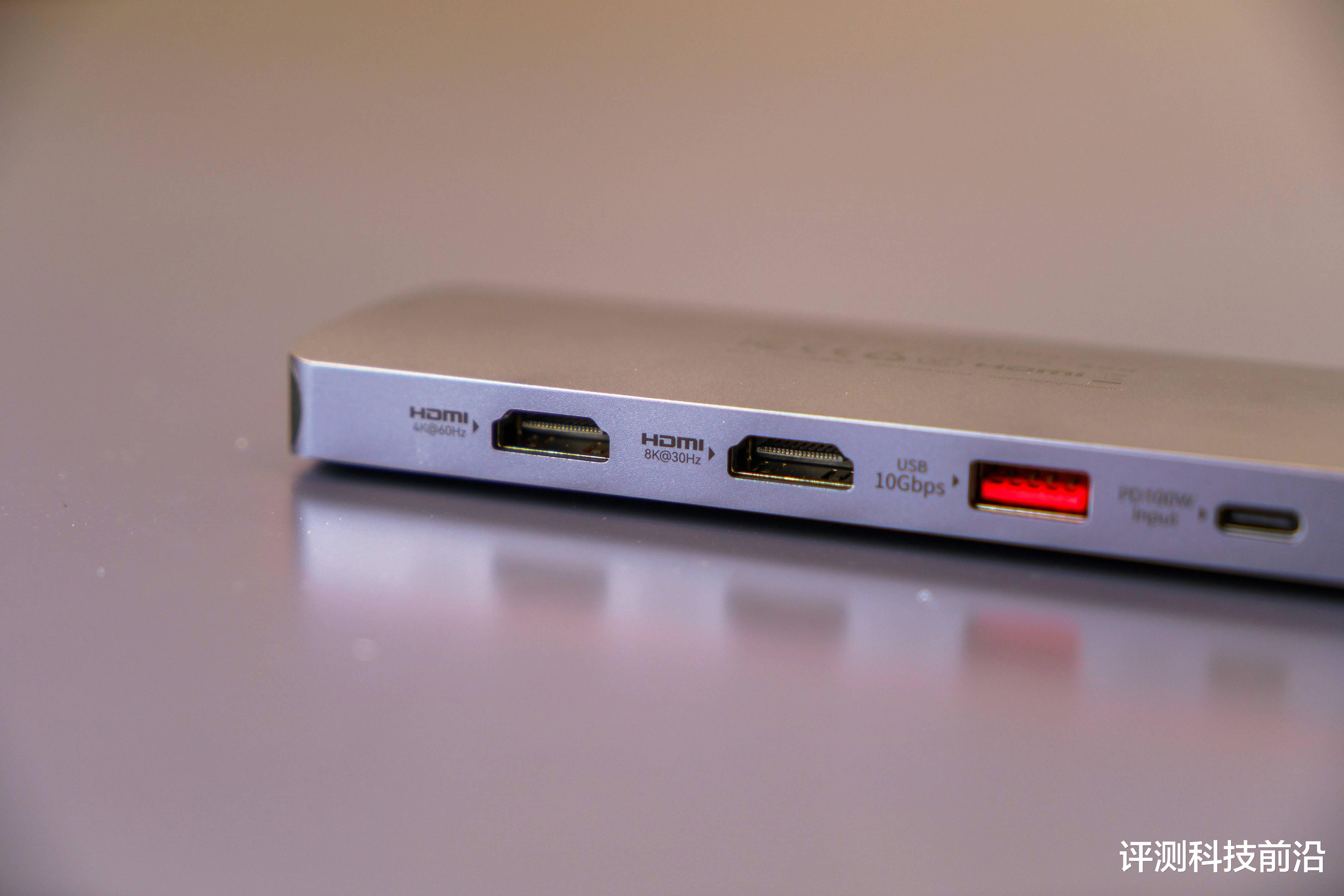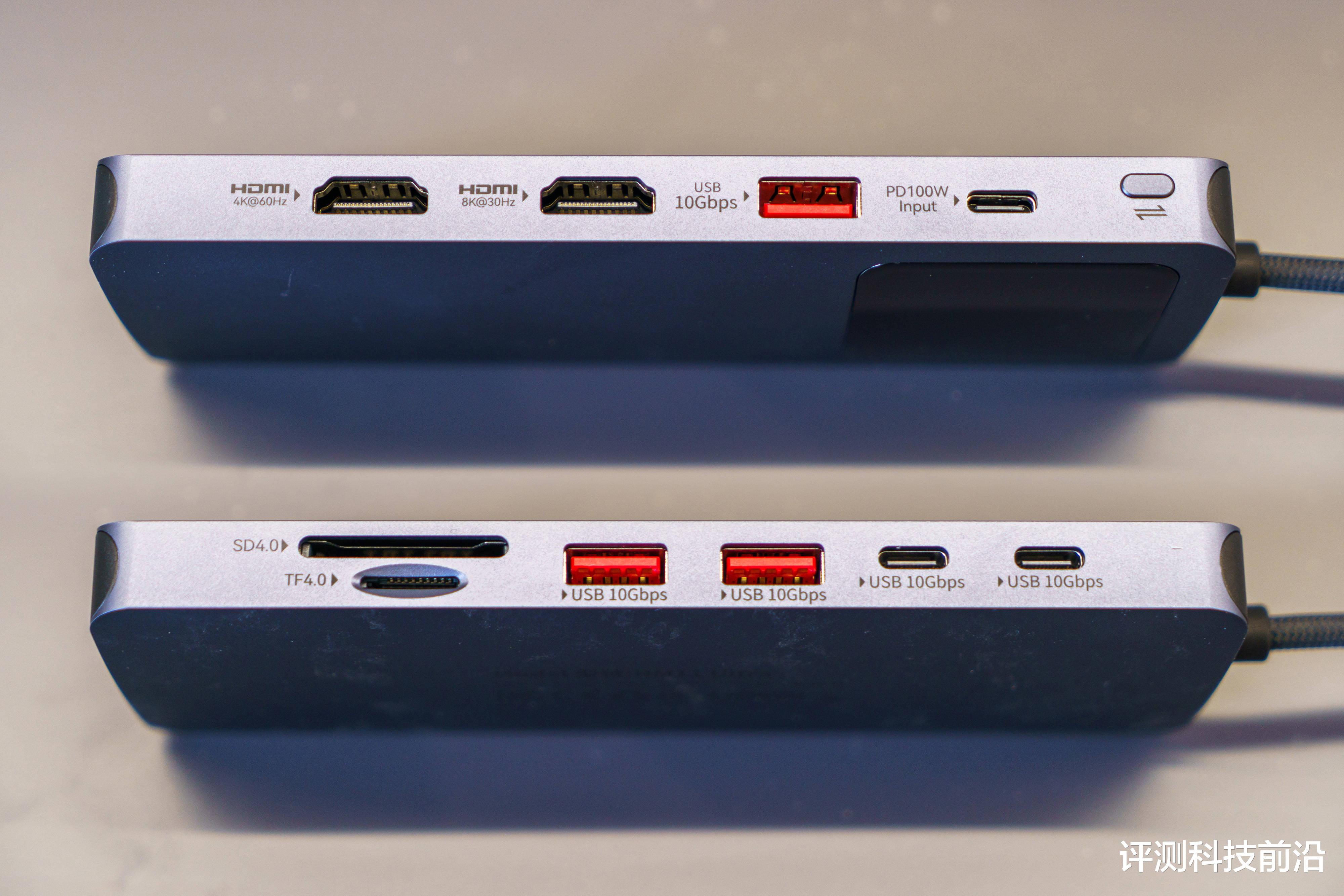 ▼它具备的接口分别为:一个HDMI2.0、一个HDMI2.1、一个支持PD100W输出的C口、三个10Gbps的A口、一个SD4.0(UHS-II)读卡器、一个TF4.0(UHS-II)读卡器、两个10Gbps的C口、一个2.5G RJ45网口,这种接口配置在便携式的扩展坞产品里已经很顶了,很强悍,左侧面上方还有个显示输出接口的切换实体按键,太牛了