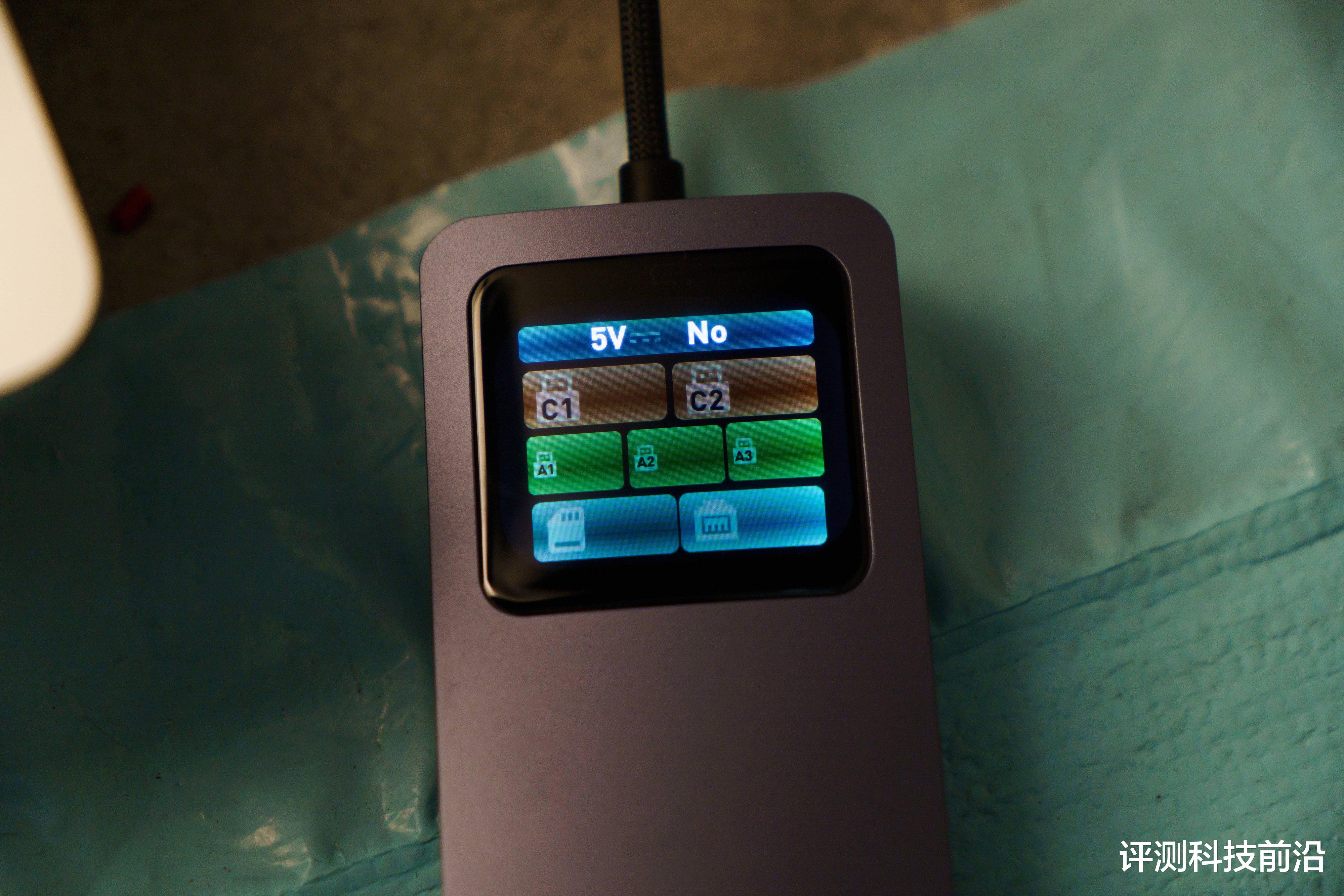 ▼把它插到设备上,屏幕主页从上到下分别显示了type-c供电输出口、两个USB-C口、三个USB-A口、读卡器、网口的工作状态