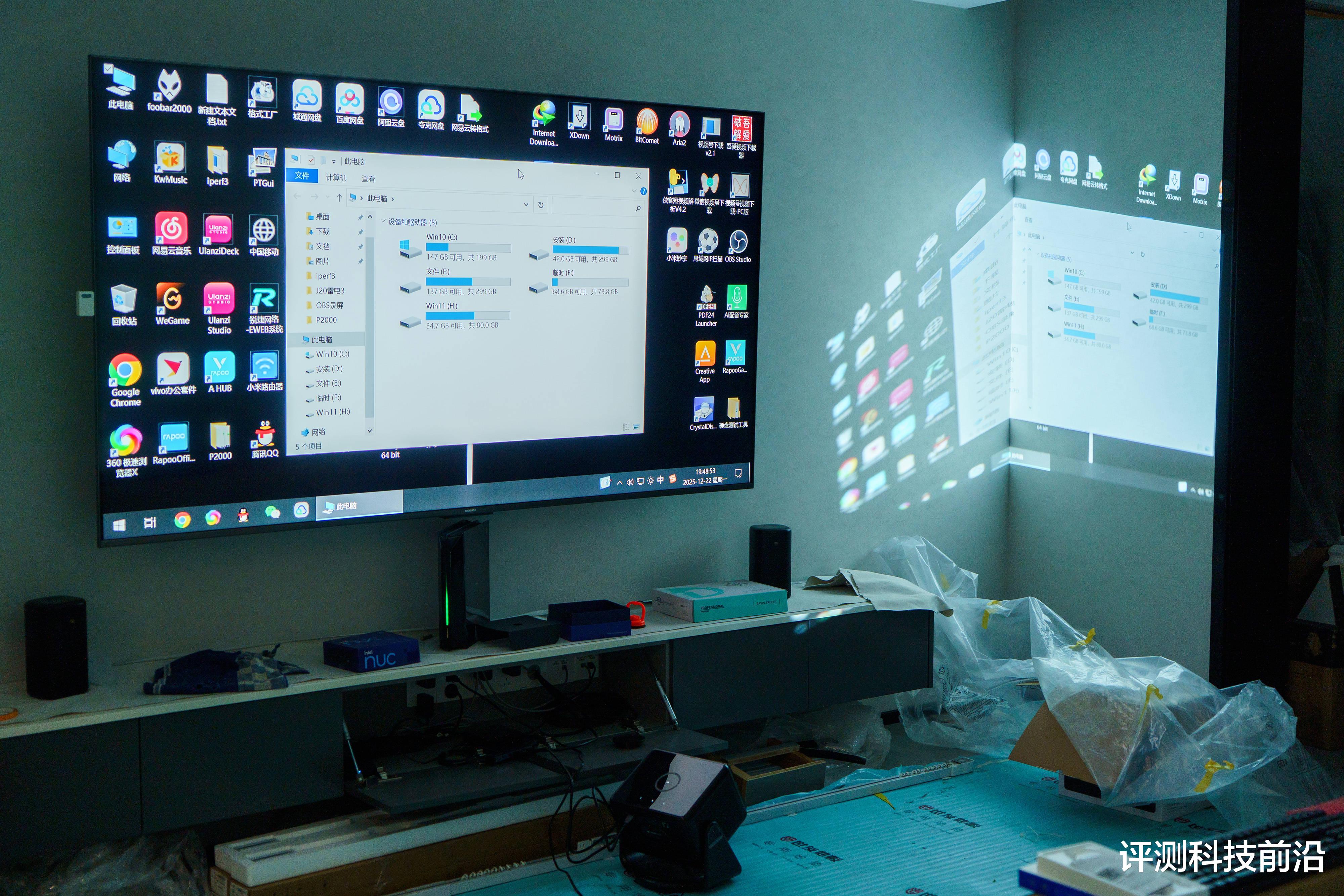 ▼当然两个接口也能同时输出画面,可以和我一样一个接电视一个接投影仪,或直接一台电脑接双显示屏,具体用法大家可以根据自己的需求发挥想象
