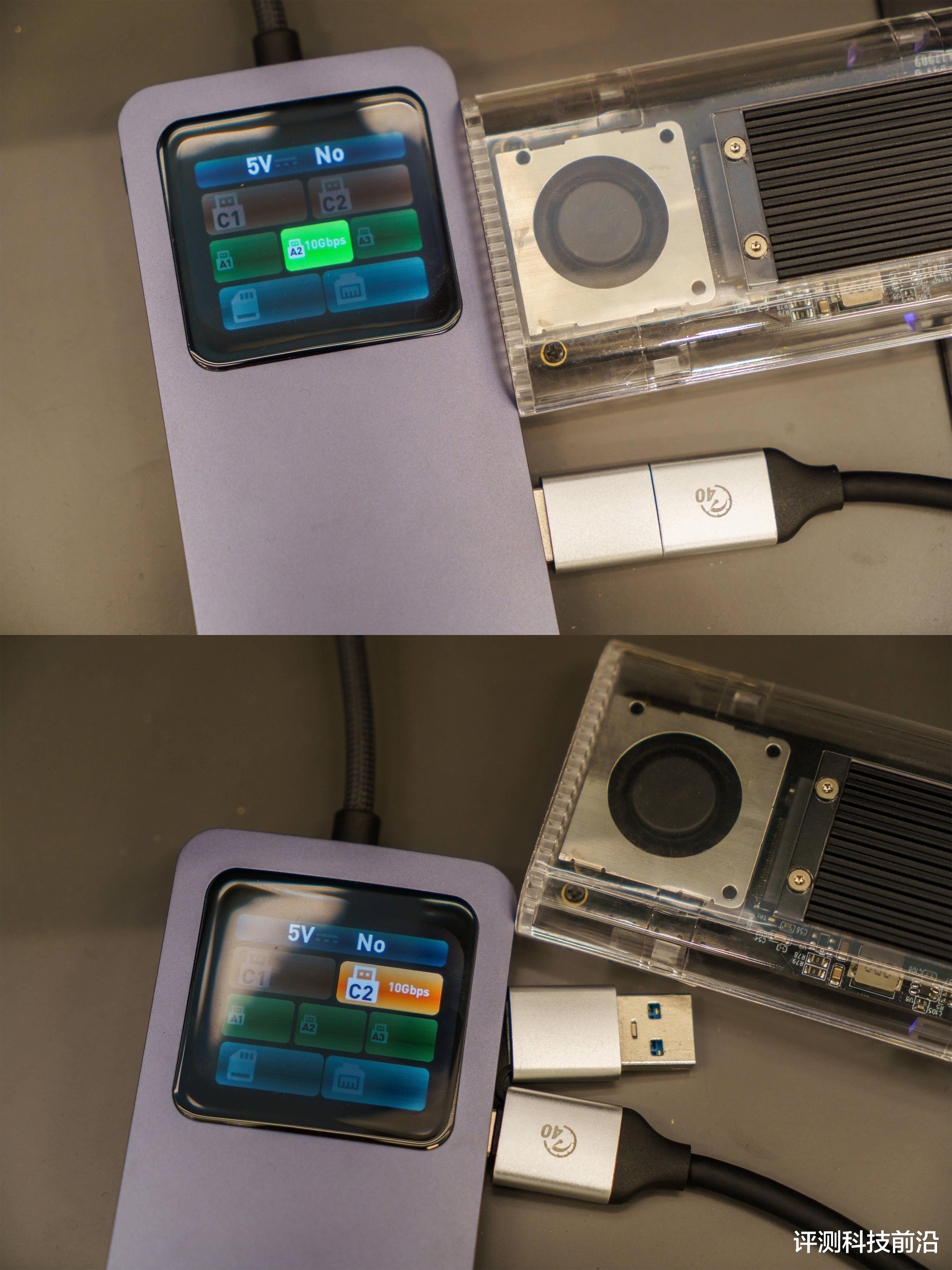 ▼当同时接入多个设备时也会一起显示,其中USB口会显示出当前握手的传输速率,内存卡也会根据插入的卡类型对应或同时显示,支持双卡同读同拷