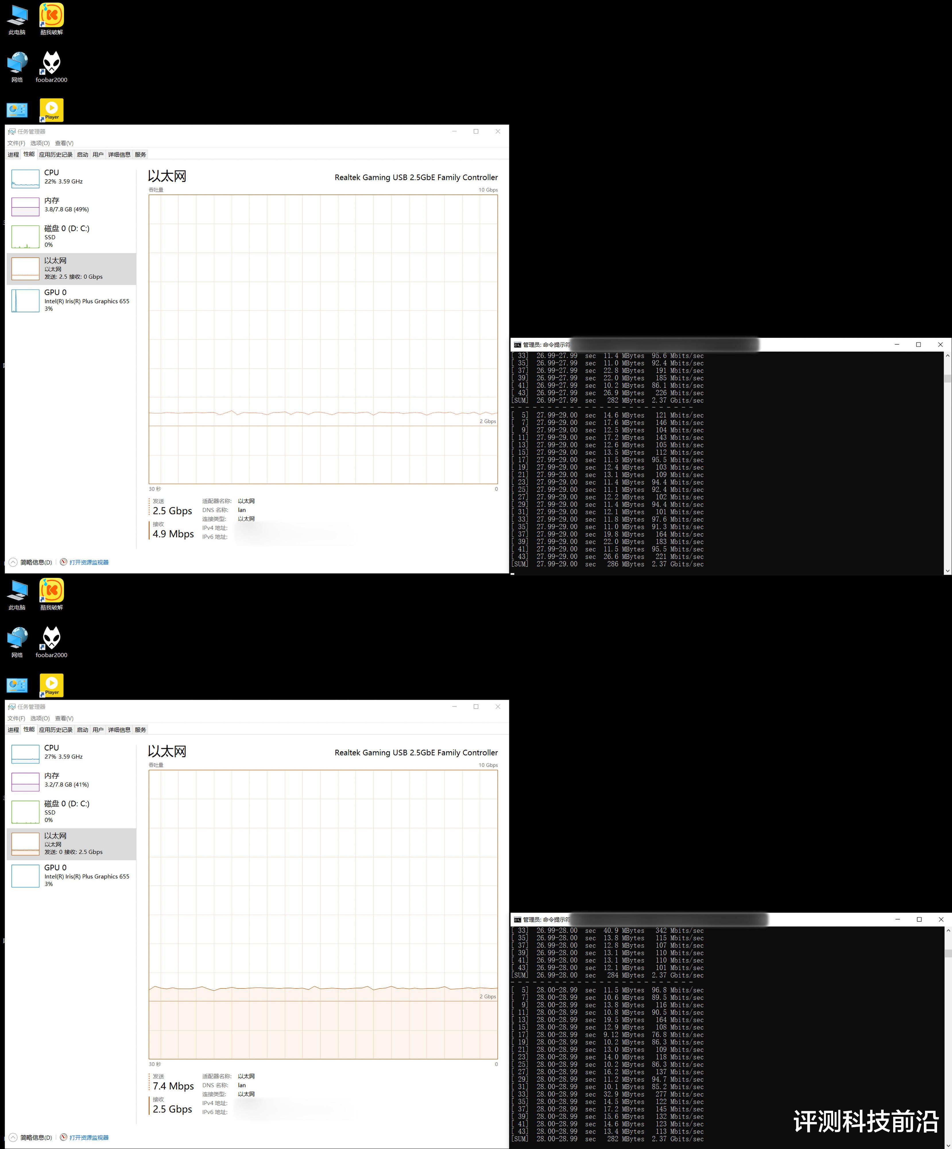 ▼接上网线后屏幕会显示当前运行的接口速率,并用iperf3进行局域网打流测试。可以看到不管是上传还是下载,除去一些干扰和损耗,这2.5G的带宽基本上是跑满了,验证了这款扩展坞的网口性能是实打实的2.5G,我也连续测试了很久,全程非常稳定没有掉速,得益于它的芯片和散热设计