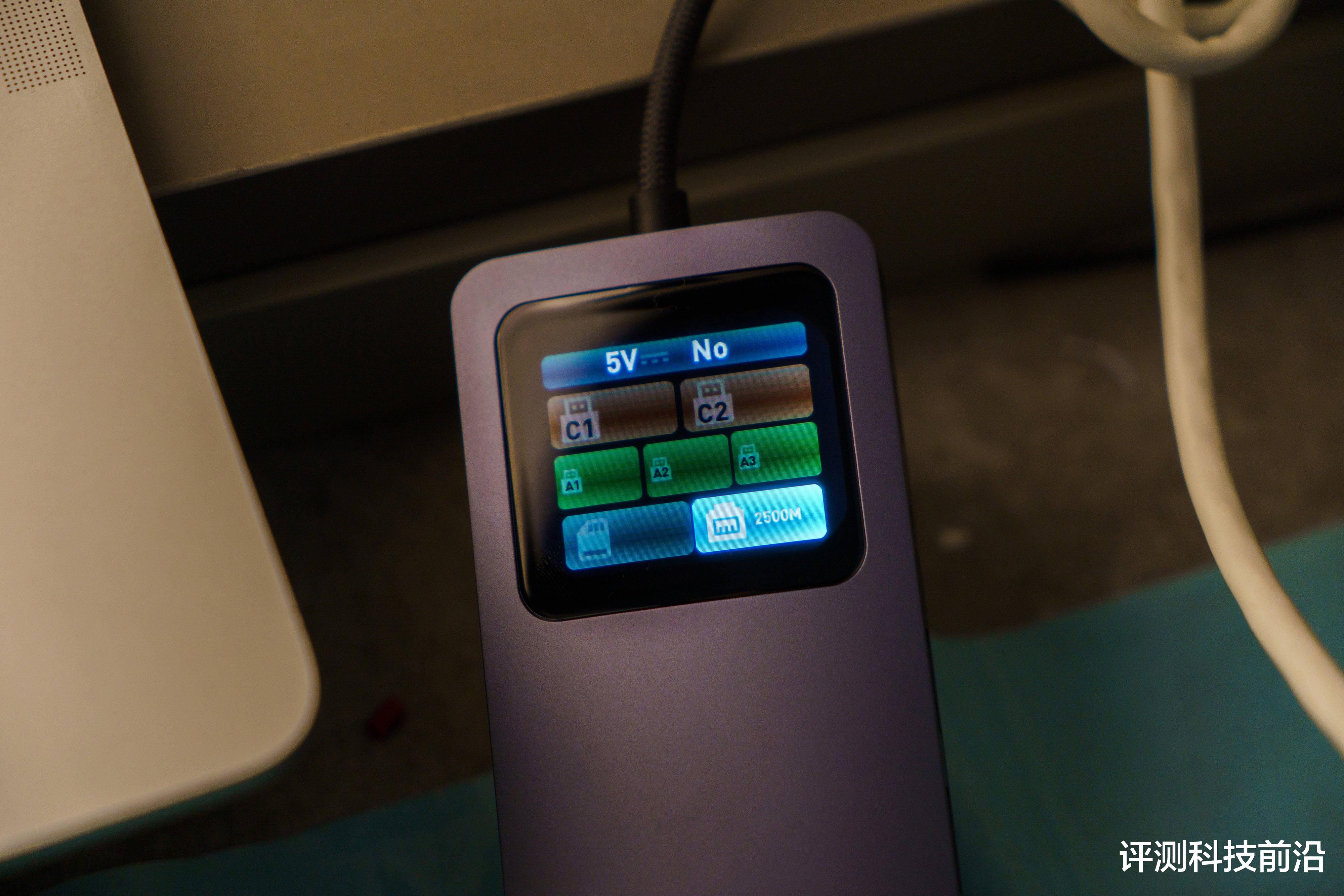 ▼整体虽然是一个常见多合一便携式扩展坞的造型,但是它和大部分产品有一个不同的地方,可以看到它正面上端多了一块黑黑的结构,那是它的显示屏,没错,便携式的扩展坞也带屏幕了!它是一款带各接口工作状态显示功能的扩展坞,科技感更足,也挺实用的,方便你清楚了解当前设备所连接的速率,大部分数码爱好者可能都会非常喜欢这类设计,也可以看到侧面的接口也排的满满当当,非常丰富