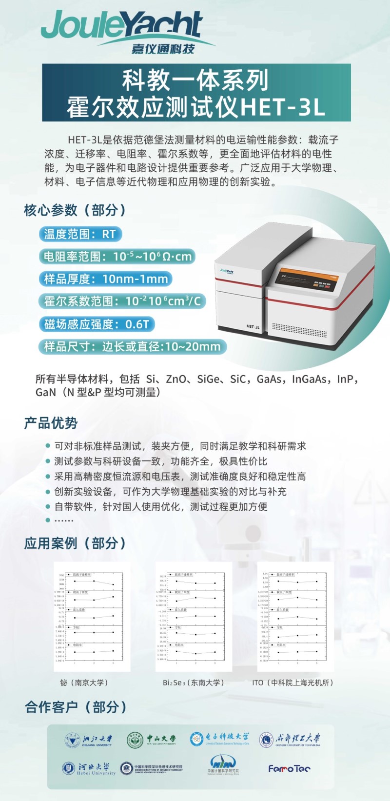 科教一体霍尔效应测试系统 HET-3L是依据范德堡法测量材料的电运输性能参数:载流子浓度、迁移率、电阻率、霍尔系数等,更全面地评估材料的电性能,为电子器件和电路设计提供重要参考。广泛应用于大学物理、材料、电子信息等近代物理和应用物理的创新实验。产品特点:可对非标准样品测试,装夹方便,同时满足教学和科研需求;测试参数与科研设备一致,功能齐全,极具性价比;采用高精密度恒流源和电压表,测试准确度良好和稳定性高;创新实验设备,可作为大学物理基础实验的对比与补充;自带软件,针对国人使用优化,测试过程更加方便;应用功能:载流子类型鉴定:确定电流携带者是正电荷的空穴还是负电荷的电子,获得半导体或导体的电子结构和能带特性;载流子浓度测量:霍尔系数与载流子浓度之间存在关系,因此通过测量霍尔系数,可以估计材料中载流子的浓度;迁移率评估:霍尔系数可以用来计算载流子的迁移率,对材料的电导率和电子迁移性等方面的深入研究;