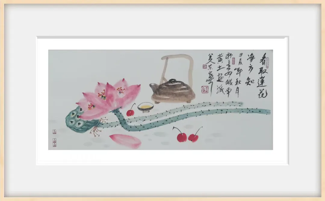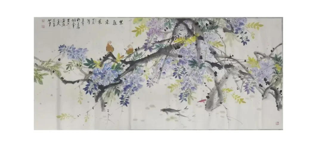 多年来,他在笔墨语言的锤炼上从未停歇:用笔上,取法篆隶的遒劲线条,画梅枝如铁骨铮铮,绘兰叶似清风拂动,一笔一画皆见传统书法的筋骨;用墨上,深谙“墨有焦、浓、重、淡、清”的精髓,或泼墨写意见气势,或破墨晕染显层次,墨色在宣纸上晕开如黄土地的烟霞,既有厚重感,又不失灵动感;用色上,摒弃艳俗之态,取“清雅如荷、温润如玉”的格调,朱砂点果、石青衬叶,色不压墨、墨色相融,让画面既富传统文人画的雅致,又含当代审美中的清新——正如刘文西先生所赞:“这些年他的花鸟画,画面更加清新有致,充满诗意灵性的营造,表现出和谐清爽、气韵流动的艺术氛围。”