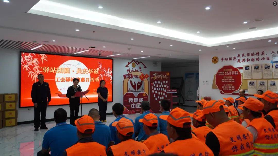为庆祝中华人民共和国成立76周年,切实将市委政府的关心关怀及工会组织的温暖送达广大职工心坎,安宁市总工会于9月28日在安宁市总工会工会驿站开展以“驿站团圆·共庆华诞”为主题的普惠日活动,户外劳动者、新就业形态劳动者及环卫工人等职工代表50余人参加活动,共迎佳节、共叙温情。