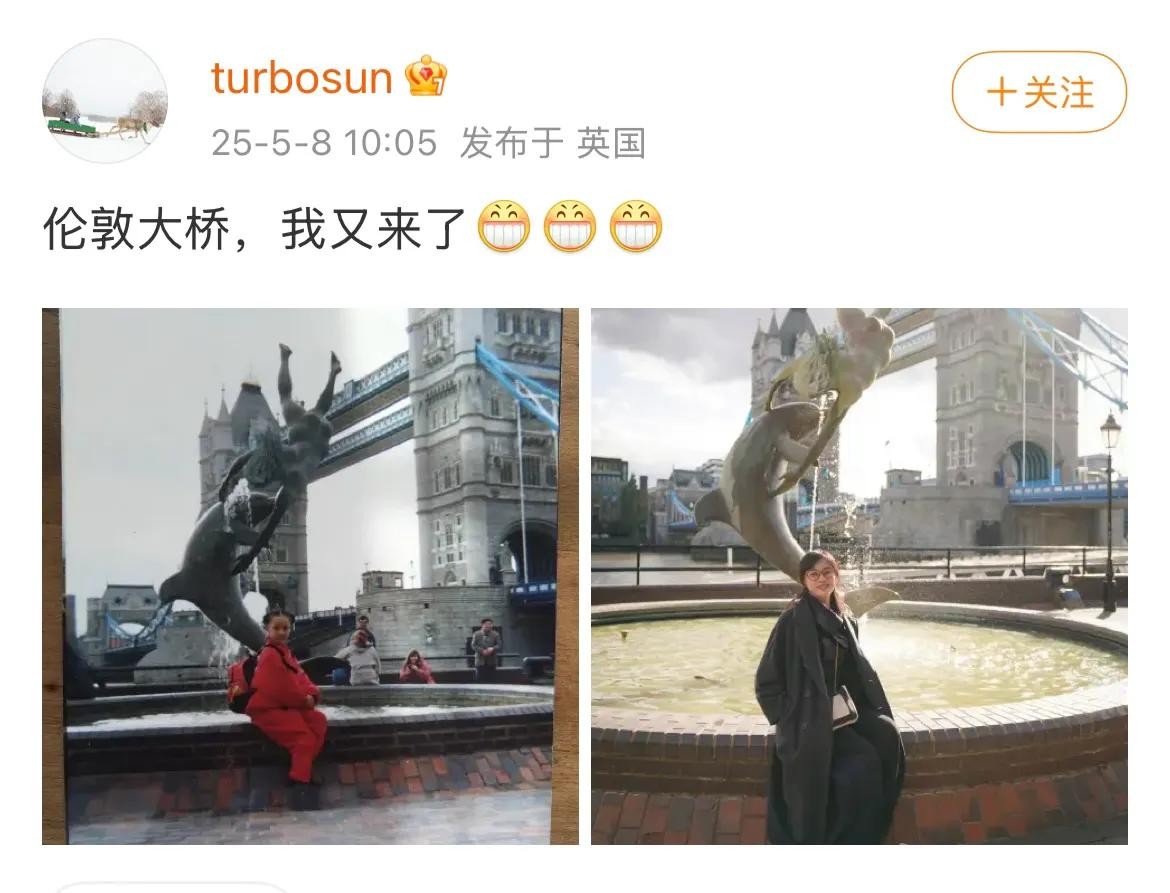 此外,孙俪还去了伦敦大桥打卡,故地重游,将自己以前跟伦敦大桥的合影一起放了出来,非常有纪念意义。
