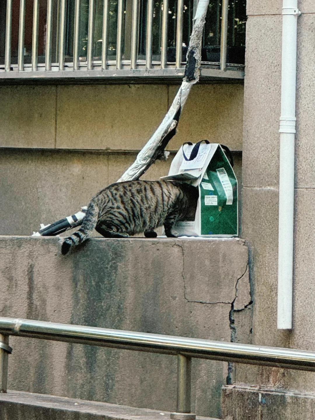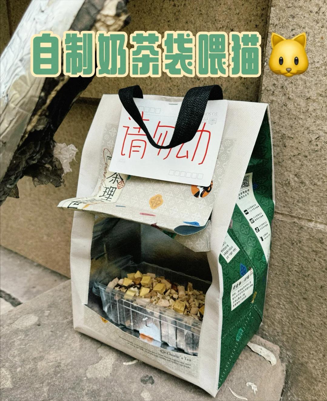 奶茶袋秒变流浪猫喂养盒,找了小猫经常出现的地方,尽量隐蔽一点,我已经跟小区管理处打好招呼,尽量不影响别人。