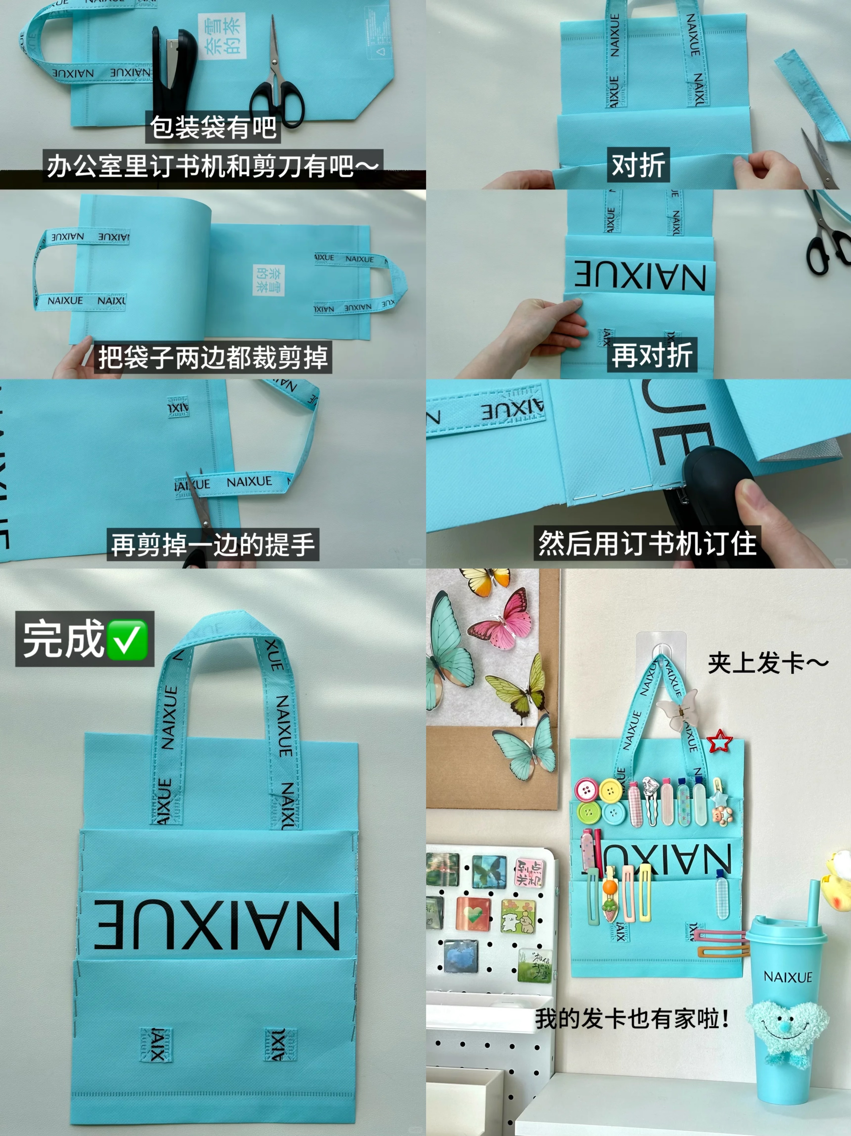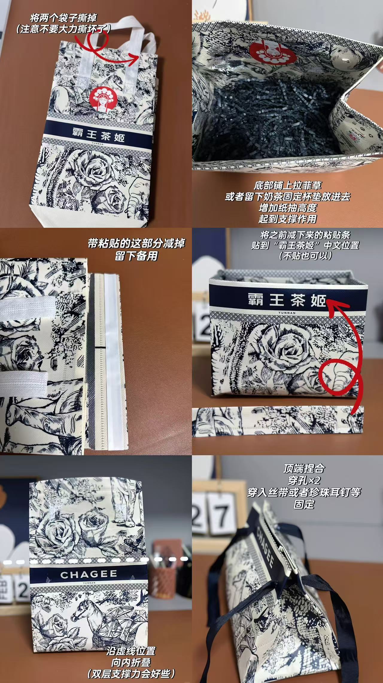 把奶茶袋两边都裁剪掉,再剪掉一边的提手,参考下方图片对折几下,用订书机订上就完成啦!