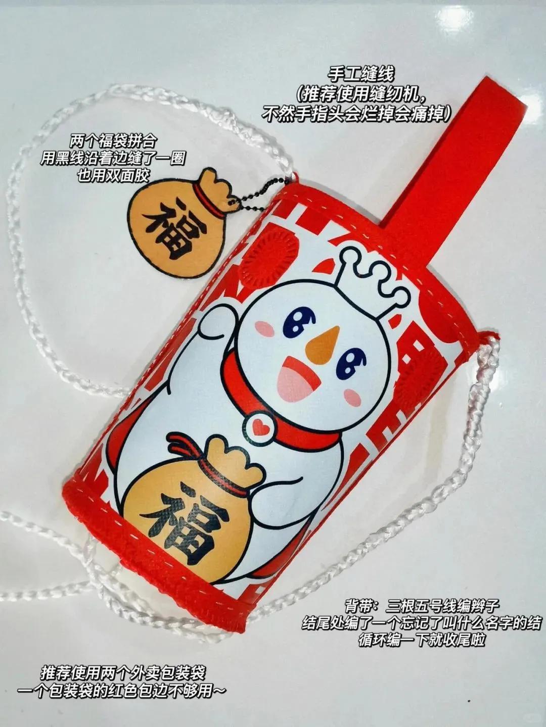 ④可以挂上小福袋,用几根绳子编成背带可以背上,最后手工缝制固定好就完成啦!