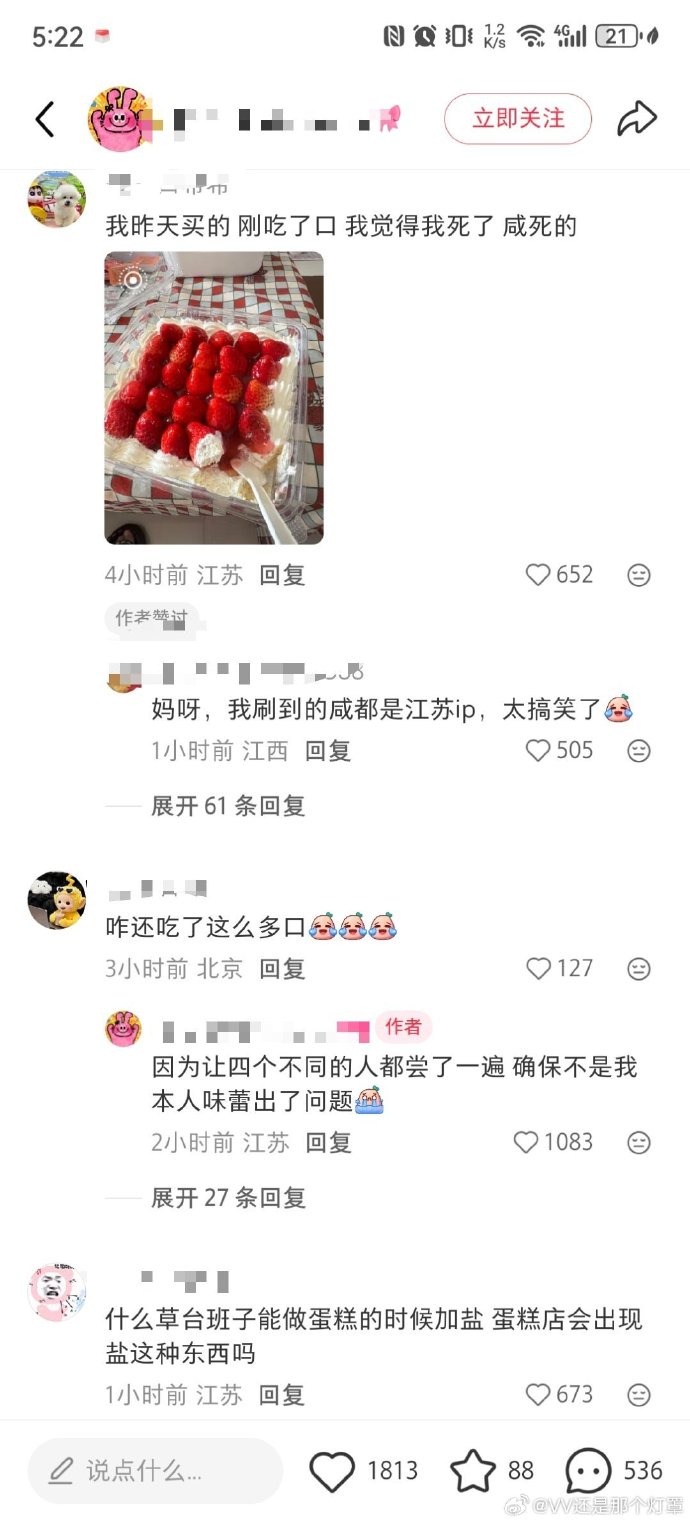 有网友说本来冲着盒马的口碑买的这款网红蛋糕,奶油部分吃着还挺正常,结果咬到蛋糕胚的瞬间,那股咸味直接“冲顶”,咸得发苦,第一反应还以为自己味觉出问题了,反复尝了好几口才确认是蛋糕的问题。还有人调侃,这怕不是生产师傅把糖罐子和盐罐子搞反了吧?“人怎么能闯这么大的篓子”。
