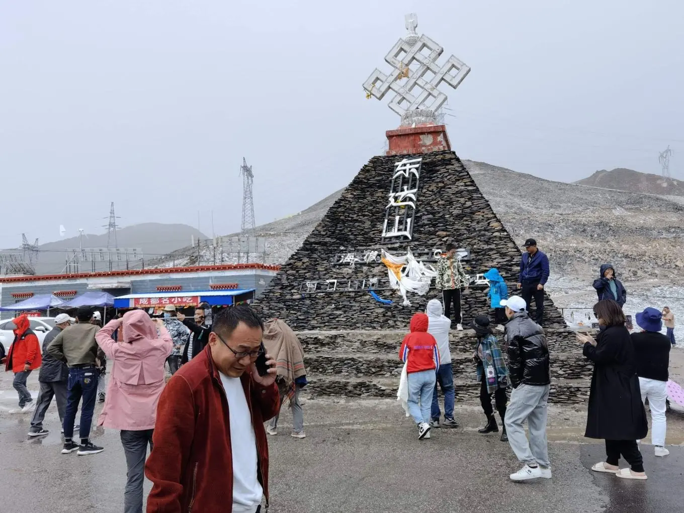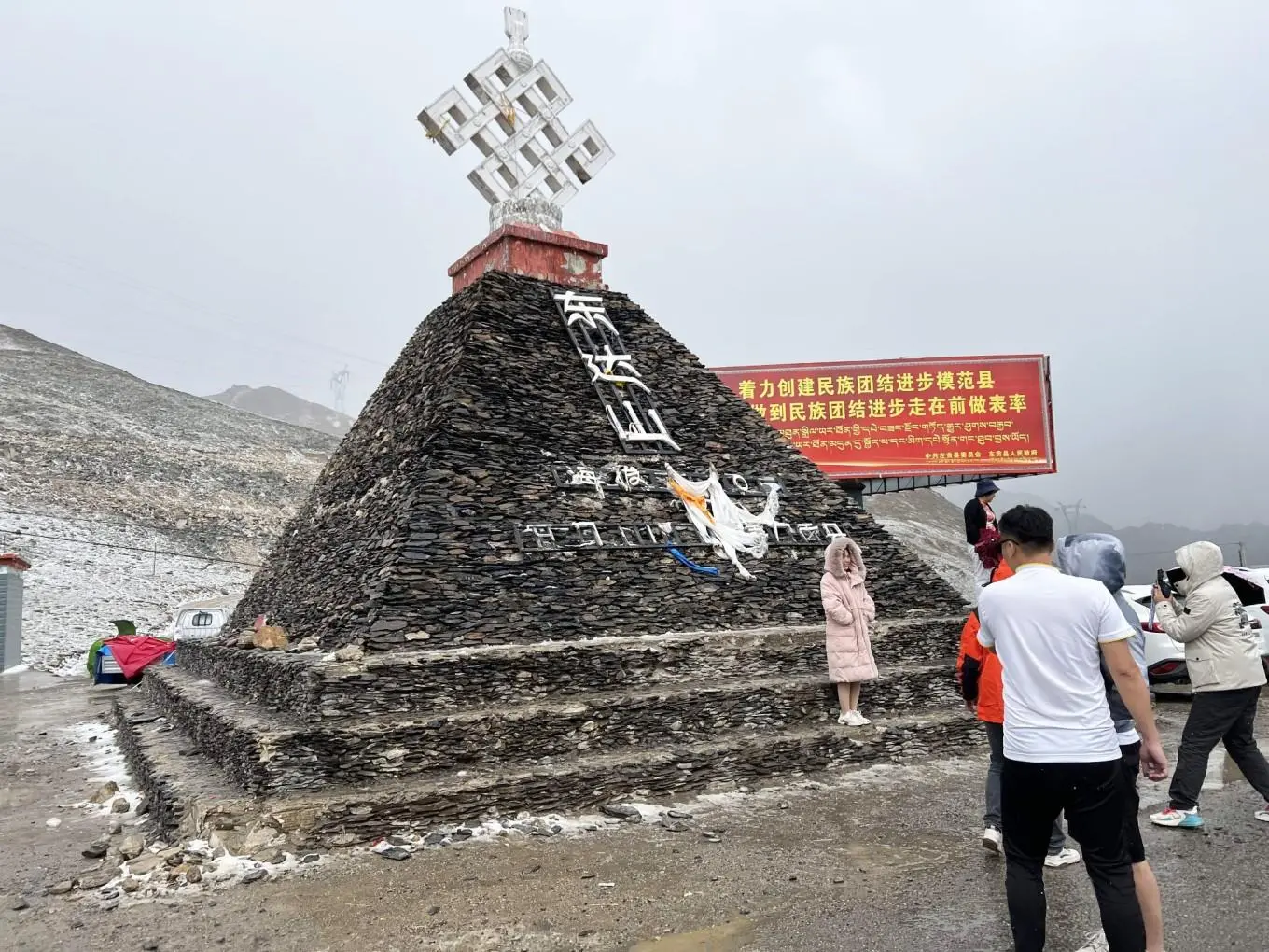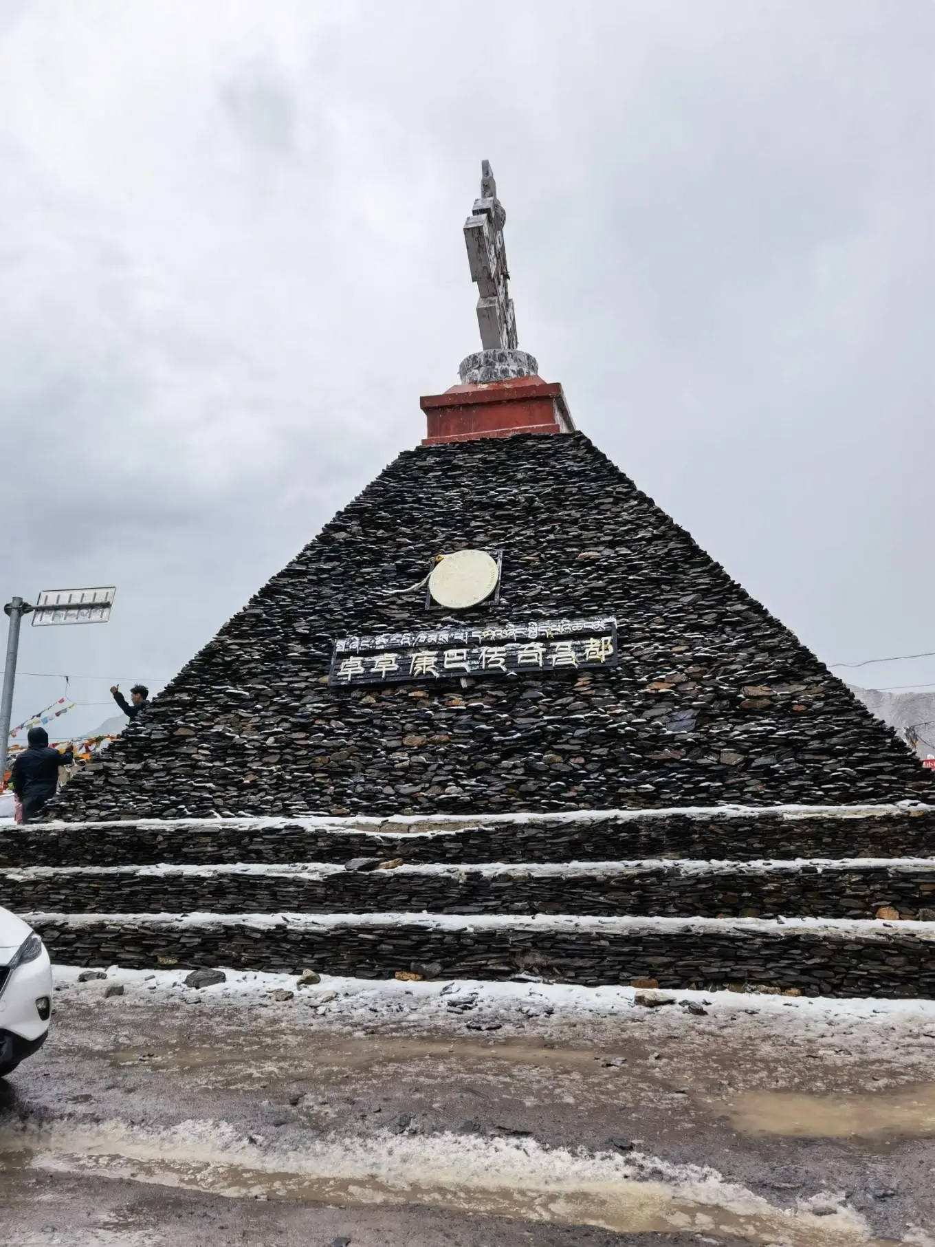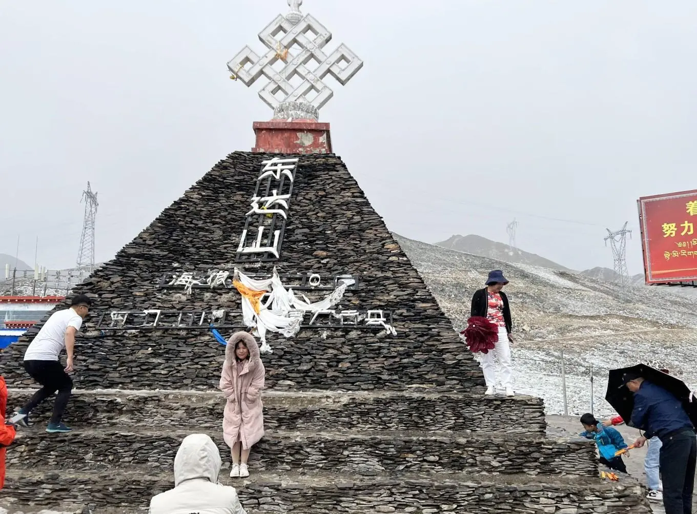 伴随一路风雪,终于到达东达山垭口,这个G318最高的垭口,一处寸草不生却是人潮车潮涌动的地方。不知道为什么,东达山垭口著名黑色金字塔标志上面的海拔5130米的数字没有了,总觉得缺少个数字好像没有被官方认证一样,难道我们没有真的到达如此之高的海拔位置吗?小小遗憾无法阻挡游人的兴致,穿着短衣短裤凉鞋或者穿着厚厚羽绒大衣的游客一样需要一个东达山的留影。