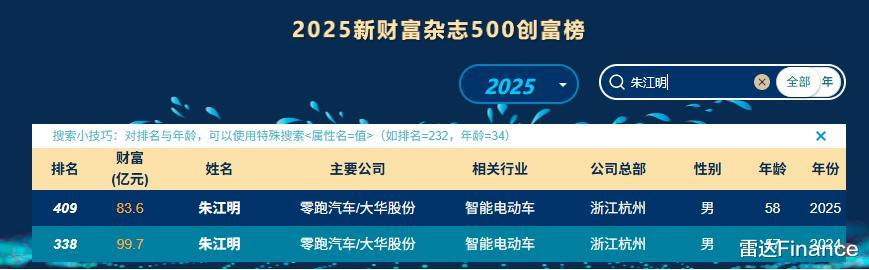 2025年,朱江明凭借83.6亿元的身家位列新财富杂志500创富榜第409名,个人财富相比2024年减少了16.1亿元。