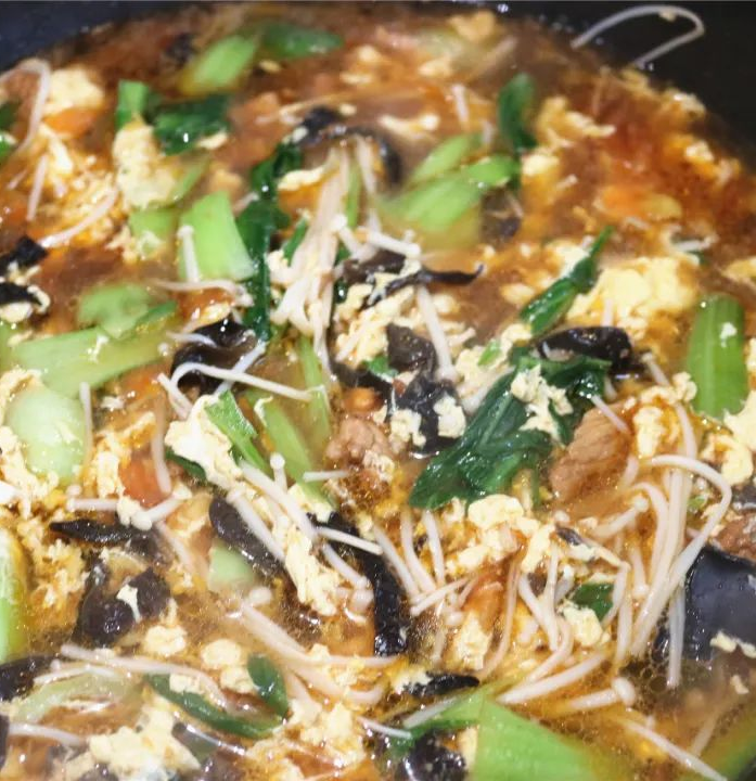 1,猪肉切成薄片,木耳泡发洗净后切丝,西红柿去皮洗净,切成小块。青菜和金针菇洗净,分别切段。