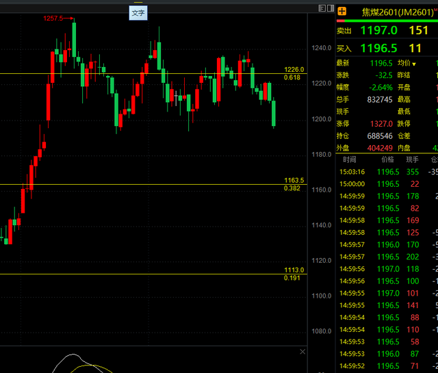 焦煤2601合约:基本面:上游焦煤库存去化放缓,523 家矿山去库 21.73 万吨,洗煤厂、港口分别累库 23.77 万吨、11.08 万吨,整体压力不大。下游独立焦企焦炭去库 1.43 万吨至 66.41 万吨,钢厂焦炭补库后可用天数增 0.13 天至 11.42 天,库存结构优化。技术面:焦煤整体上涨乏力,初现颓势1225平台破位,短线级别死叉向下趋势看弱下方支撑先看1160支撑情况操作建议:焦煤反弹高空为主下方支撑1160