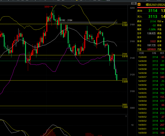 螺纹钢2601合约:基本面:螺纹钢主要应用于房地产和基础设施建设领域,9 月 4 日至 9 月 10 日,螺纹钢表需为 198.07 万吨,环比减少 4 万吨,同比下降幅度更为明显,五大钢材品种表观消费量同比下降 84.26 万吨,其中螺纹钢消费同比下降达 81.13 万吨,显示出需求端显著疲软。下游订单情况也不容乐观,钢厂在手订单仅可维持 15 天左右,低于正常水平,下游采购意愿谨慎,多为按需采购。技术面:螺纹在经过长时间调整过后跌破了3140支撑尾盘加速下探,目前短线支撑位在3110,目前空头多周期共振看跌,3110破位后目标3080先看支撑情况操作建议:螺纹钢反弹高空为主