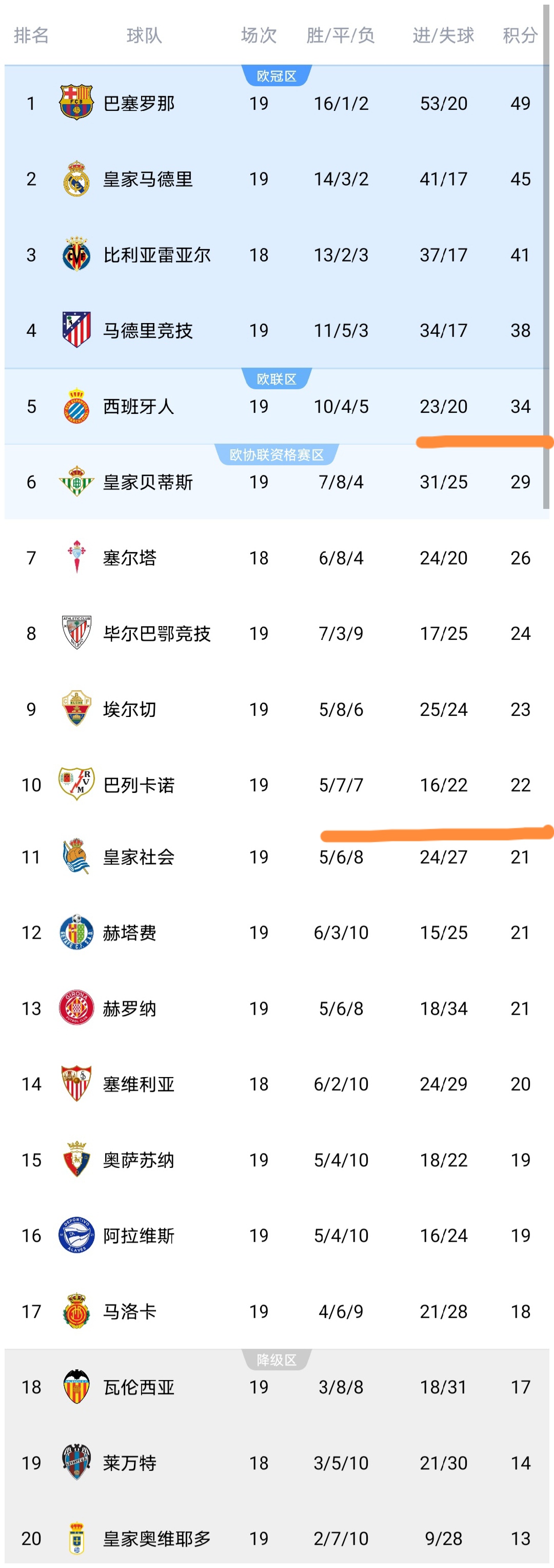 昨晚至今天凌晨,西甲第19轮又结束了2场较量,巴列卡诺PK马略卡,莱万特PK西班牙人,这两场比赛结束之后,西甲积分榜更新,我们来看看。