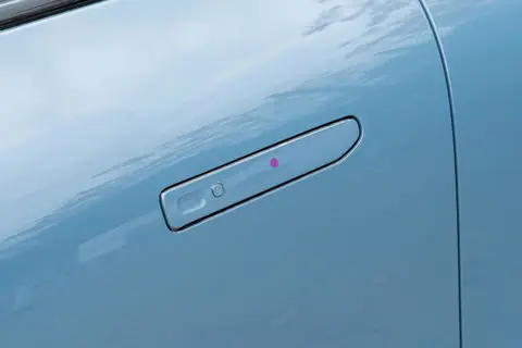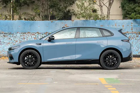 前脸采用的是主动闭合式进气格栅设计,看着比较简洁,没有多余的装饰,大灯造型锐利,点亮后辨识度挺高。车侧线条也很流畅,从车头一直延伸到车尾,搭配19英寸的大轮毂(全系标配),运动感直接拉满。让人惊喜的是无框车门,这个价位能有这个配置真的少见,开关门的阻尼很均匀,没有松散的感觉,密封做得也不错,跑起来风噪控制得比预想中好。而且它还用了前225/45 R19、后235/45 R19的“鸳鸯胎”设计,这种设计在性能车上比较常见,能提升抓地力,看着也更运动;