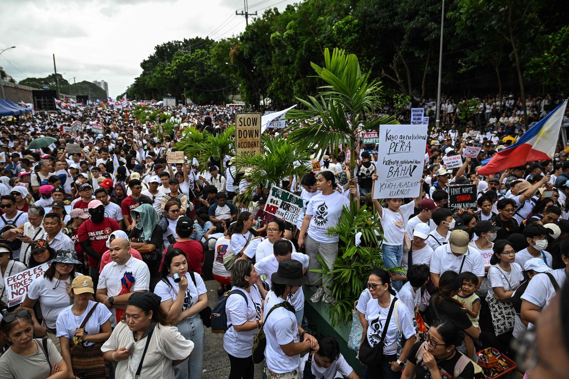 据新加坡《联合早报网》报道,成千上万菲律宾民众星期天(9月21日)在首都马尼拉及全国20多个城市示威,抗议防洪项目贪腐丑闻导致国家及人民蒙受巨额损失。在马尼拉总统府附近则爆发警民冲突,多名警察在冲突中受伤,72人被捕。