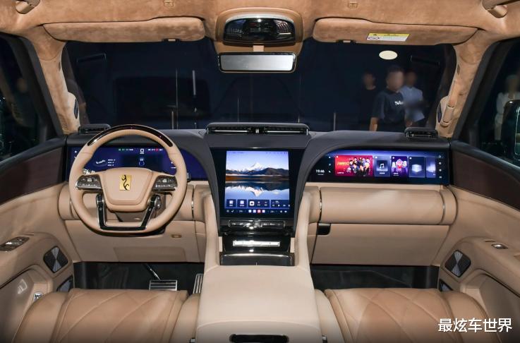 座舱内的设计也很简单,新车延续了仰望U8的中控区域设计,环抱式座舱布局营造出舒适温馨的氛围感,黑棕色撞色内饰搭配随处可见的软包材质和缝线设计,外加多处采用的实木材质装饰,为座舱营造出不俗的质感。此外,新车还配备了23.6英寸液晶仪表、12.8英寸中控屏、23.6英寸副驾驶娱乐屏,虽然并不是那种高分辨率大联屏设计,但略带弧度的中控屏设计看起来确实挺显高级。此外,前排座椅的坐姿高度相对较高,尽管仪表台整体轮廓偏饱满,但坐在主驾驶的位置向前方看,行车视线并不会受到太多干扰,而且座椅的包裹感和支撑性也都不错。至于方向盘中心的车标,官方介绍也可以选装为24K黄金LOGO。