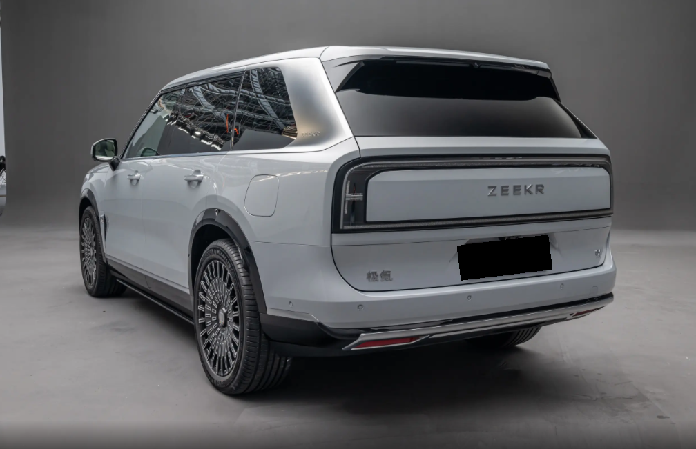 尾部设计上的话,极氪9X则有一种较强的层次感在其中,毕竟大量的横直线条集成在车辆的尾部,并且尾灯组也是环绕式的贯穿设计,且与车头大灯一样,该车的尾灯组同样采用了熏黑式的处理,点亮后有效的提升了车辆的美观程度。至于后包围的设计上,极氪9X则采用了银色的线条处理,倒也有一种较强的精致感在其中。
