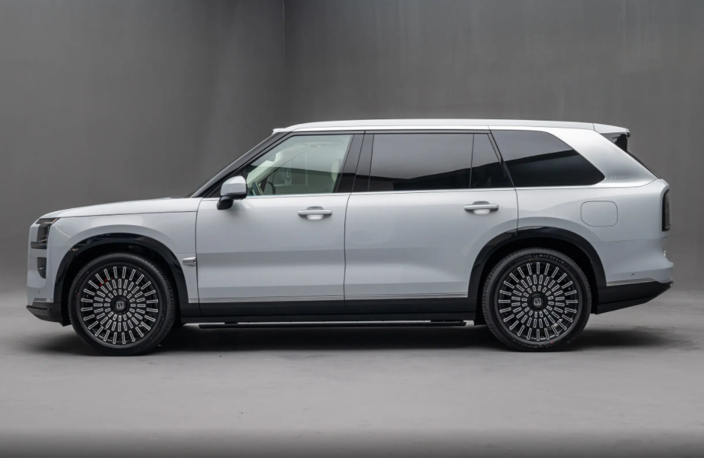 侧身设计上,极氪9X同样是硬派的设计风格,而且A柱方面,该车更是采用了黑色的涂装设计,从而在视觉效果上营造出一种悬浮式车顶的既视感,并且车顶的线条方面,该车也是平直的线条设计,再加上大尺寸的大饼轮毂,让车辆更显豪华。