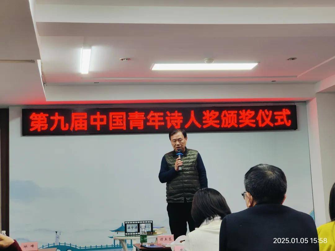 2023年度第九届中国青年诗人奖颁奖仪式由老舍文学院诗歌班学员、第四届中国青年诗人奖获得者刘雅阁女士主持,她在精彩的开场白后,对于与会嘉宾逐一给予了热情、隆重的介绍。随后,中国青年诗人奖评委会主任、《青年诗歌年鉴(2023年卷)》主编、北京师范大学文学院教授、著名评论家谭五昌先生上台发言,他向与会嘉宾详尽介绍了前面八届中国青年诗人奖评奖,以及《青年诗歌年鉴》编选与出版的种种不易与艰难过程,他表示,中国青年诗人奖的评选,《青年诗歌年鉴》的编选都是为了给广大有才华、有潜力、有抱负的青年诗人搭建一个良好的平台,具有特殊重要的意义与价值,因为青年诗人是中国诗歌的未来,希望寄托在青年诗人身上。在中国青年诗人奖的评选与《青年诗歌年鉴》的编选过程中(一个奖,一本书,二者完全匹配与对应,紧密结合在一起),谭五昌教授把自己的时间、精力与金钱都无私地投入进去了。为了推动中国青年诗歌事业与中国当代诗歌事业的发展与繁荣,谭五昌教授夜以继日的工作,不辞辛苦,可以说为诗歌付出了一切。谭五昌教授以自己亲身的经历,语重心长的希望中国当代诗人,尤其是青年诗人应自觉地加强自己的人格建设。他认为,一个人想成为杰出、伟大的诗人与评论家,没有健全与伟大的人格是做不到的,他强烈呼吁在一些当代中国诗人身上存在的自高自大、无所敬畏、心胸狭小、嫉贤妒能、追名逐利、爱慕虚荣、灵魂阴暗等精神毛病尽快改掉,呼唤诗坛多一些有大格局、大情怀、大境界、大悲悯、大担当的诗人出现,唯有如此,中国诗歌在21世纪的繁荣、辉煌与伟大复兴才有可能,青年诗人应在艺术技巧与人格修炼两个层面同时努力,才能拥有光明的前途。谭五昌教授真诚、恳切的话语赢得现场阵阵热烈的掌声。