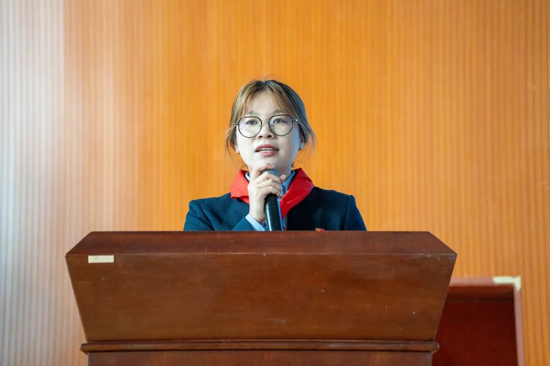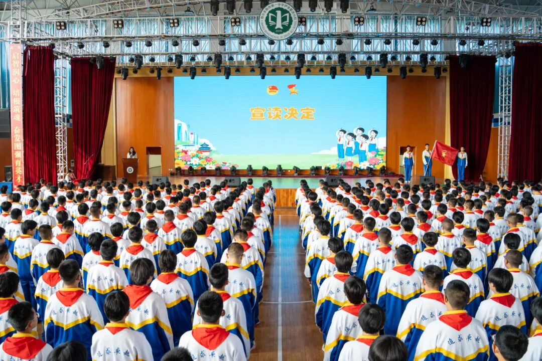 校团委书记杨蕾老师宣读《市一中分校成立初一年级少先大队、少先中队及聘任中队辅导员的决定》。她勉励全体少先队员牢记教导,树立远大志向,立志成长为有理想、有信念、有担当的新时代好队员。