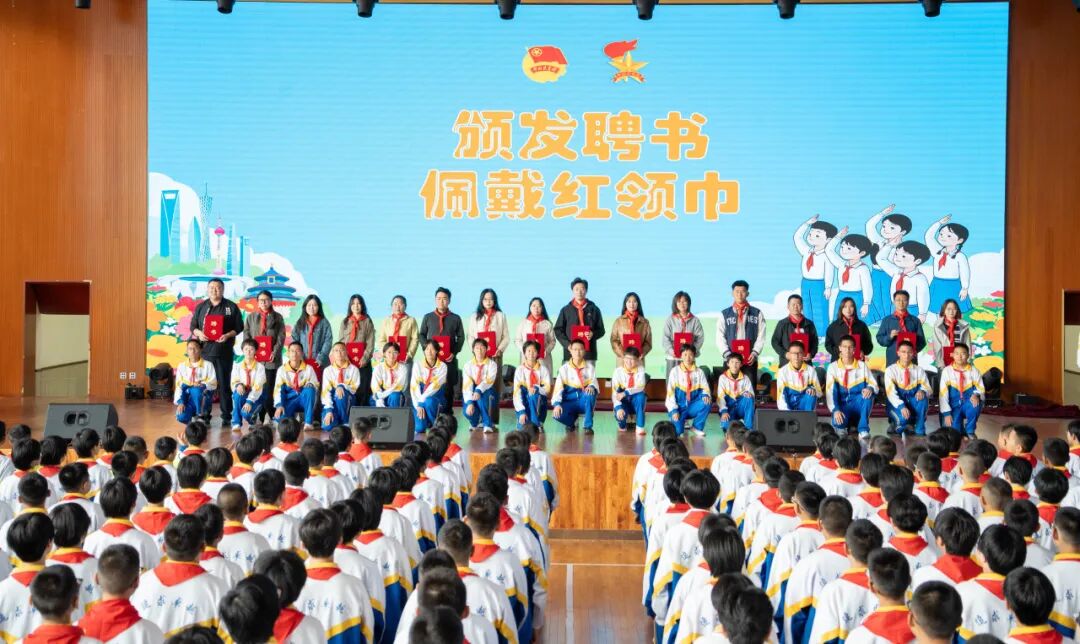 校团委书记杨蕾老师为初一年级少先队大队授旗,并为大队辅导员李娜老师颁发聘书。校党总支书记刘桂林老师为16位中队辅导员颁发聘书,各中队长为辅导员佩戴红领巾。鲜艳的红领巾承载着信任与期望,也见证着新时代少年先锋的责任与荣光。