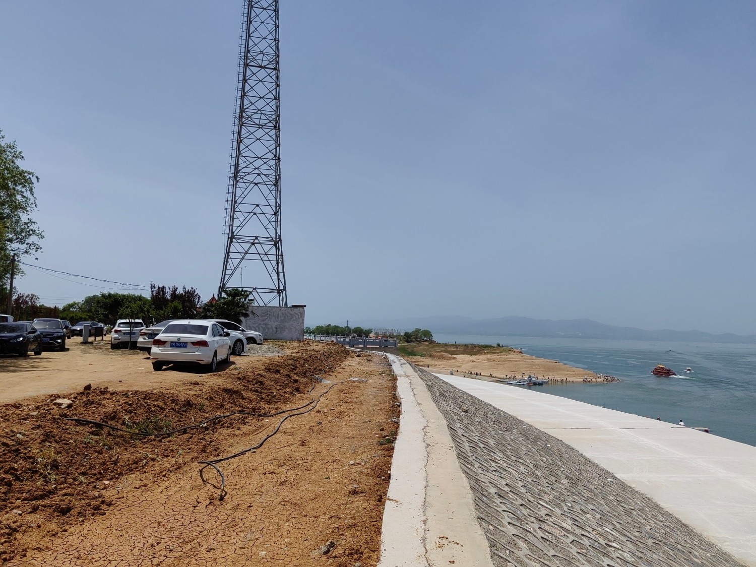 自马登下高速,沿省道驶向宋岗,游客与车辆汇聚,车流缓缓蠕动。高坝与小岛环抱出一湾碧水,沿岸停泊着游船、快艇和铁驳船,热闹非凡。河堤共分四层,宽阔的混凝土堤路环湾而建,台阶层层而下,直至船泊处。环岛而行,未发现车辆通往下层堤路的路径,只能徒步登岛,登高望远,领略无限风光。