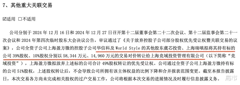 2024年底,华信科、World Style剩余49%股权被原股东以6.3亿元对价转让给上海竞域投资,上市公司放弃优先受让权。