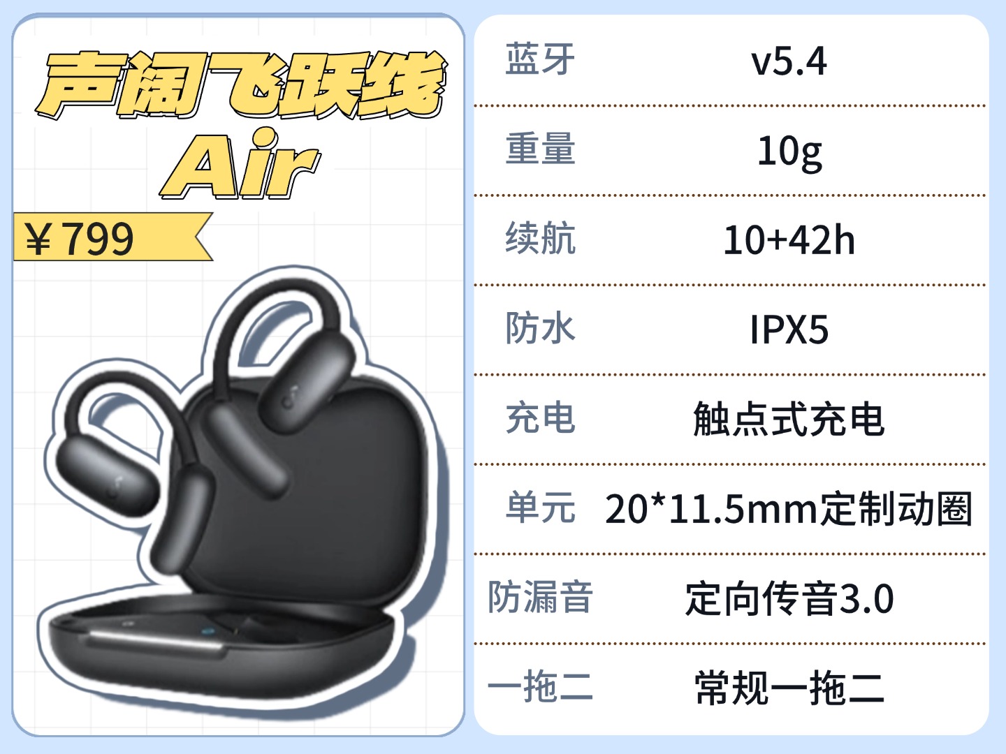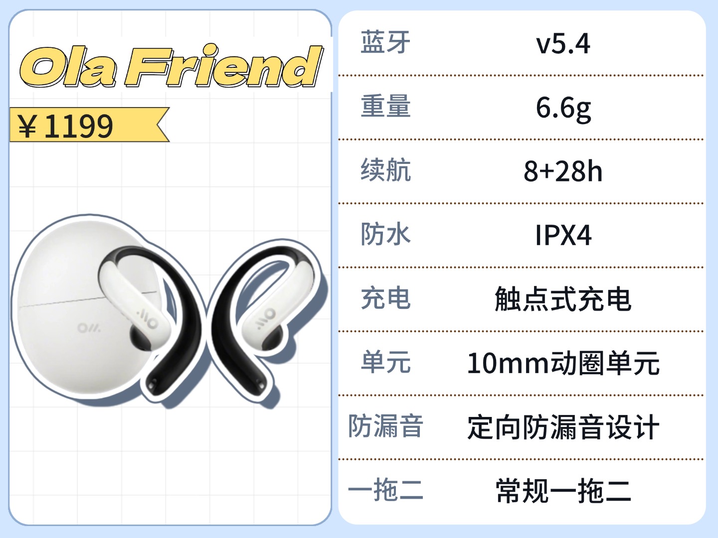 不过它的佩戴体验是真的绝,机身轻得离谱,再加上黄金夹角的错位设计,能完美贴合耳型曲线。戴大半天下来,既不硌耳也不闷痛,轻盈又舒服,就算跑跳也不容易滑脱,完全没什么负担。所以总结下来,要是你对佩戴舒适度有刚需,特别在意长时间佩戴的体验,那它值得一看;但如果追求音质和性价比,这款就不太推荐了。
