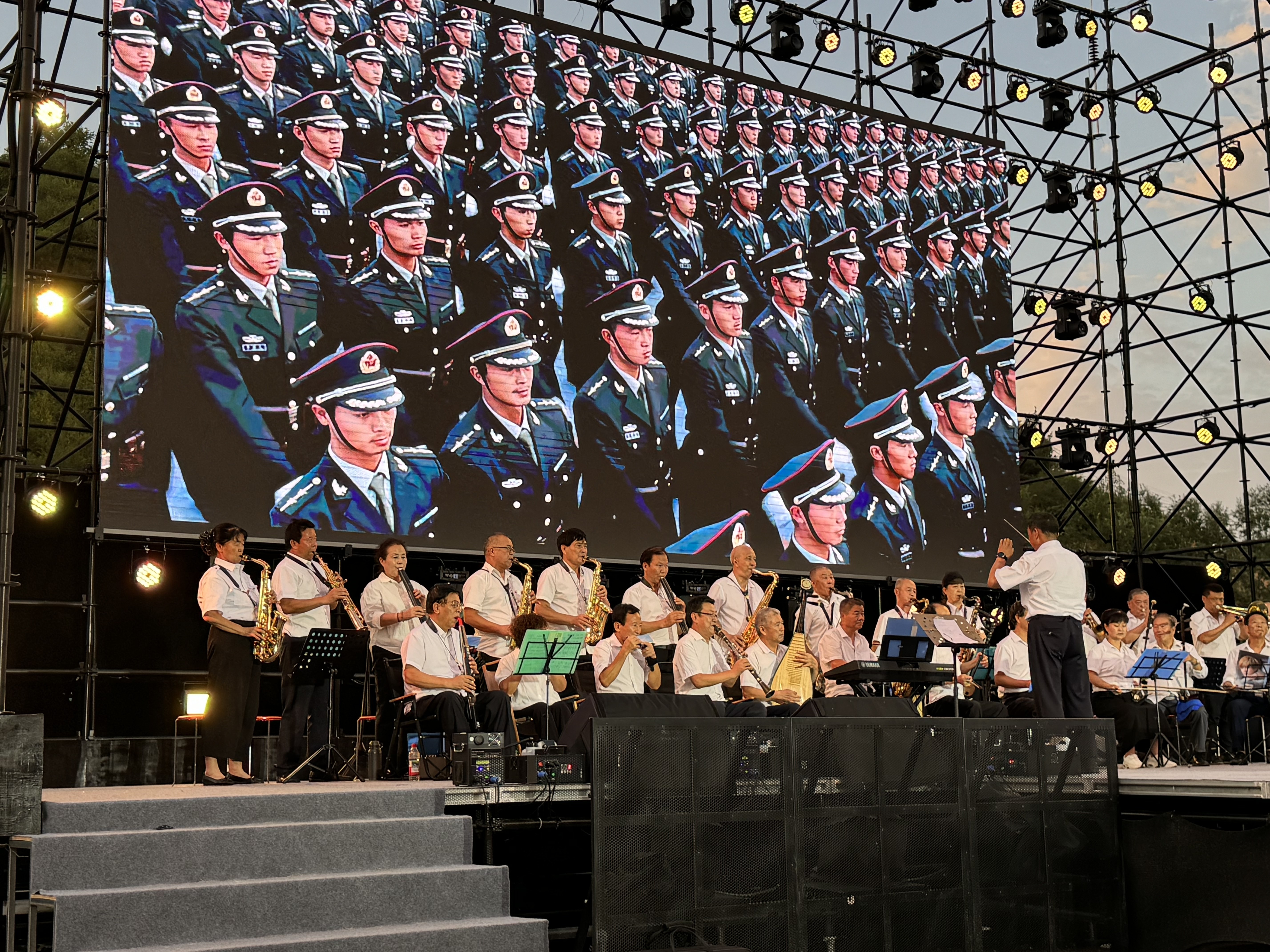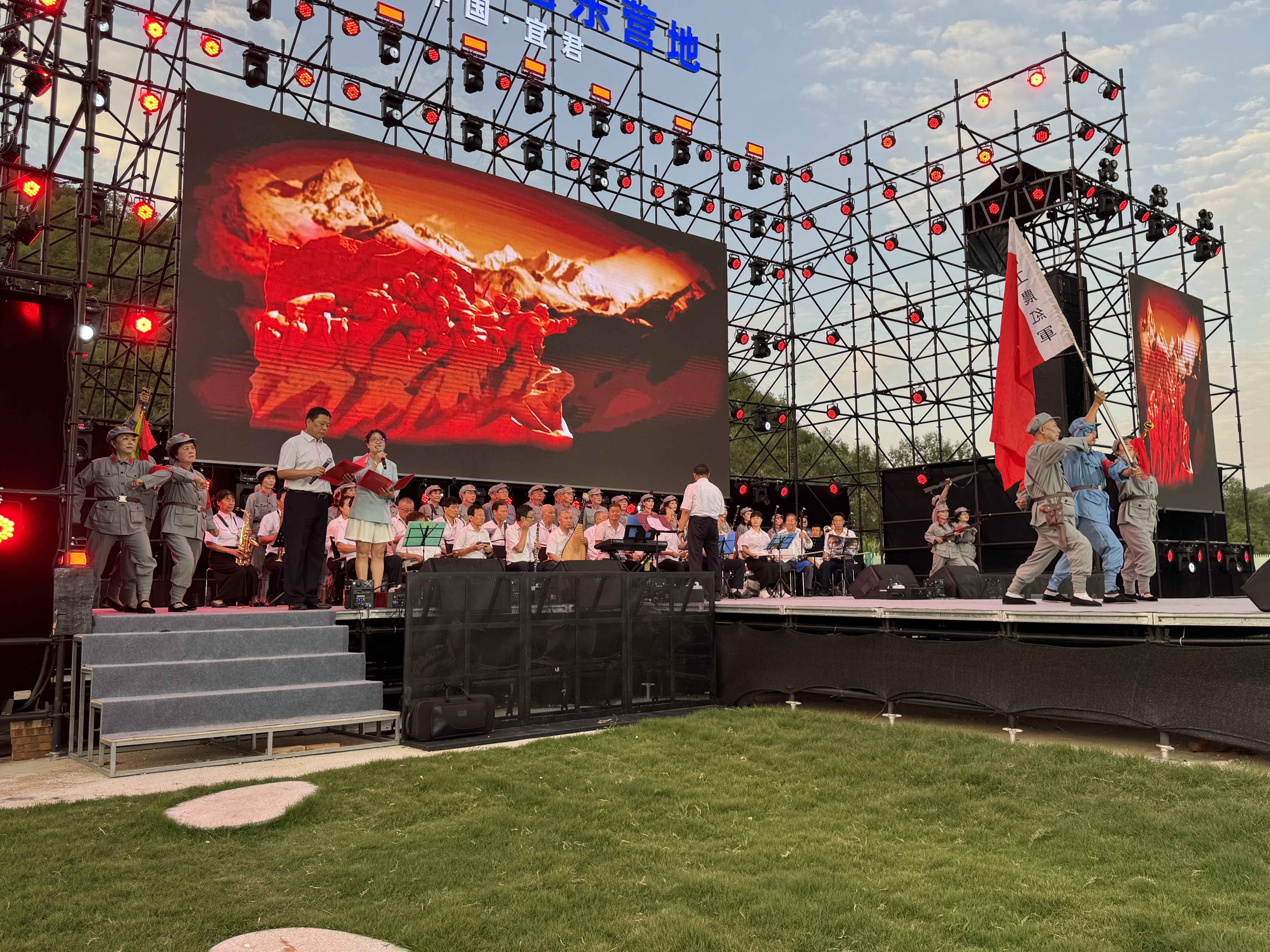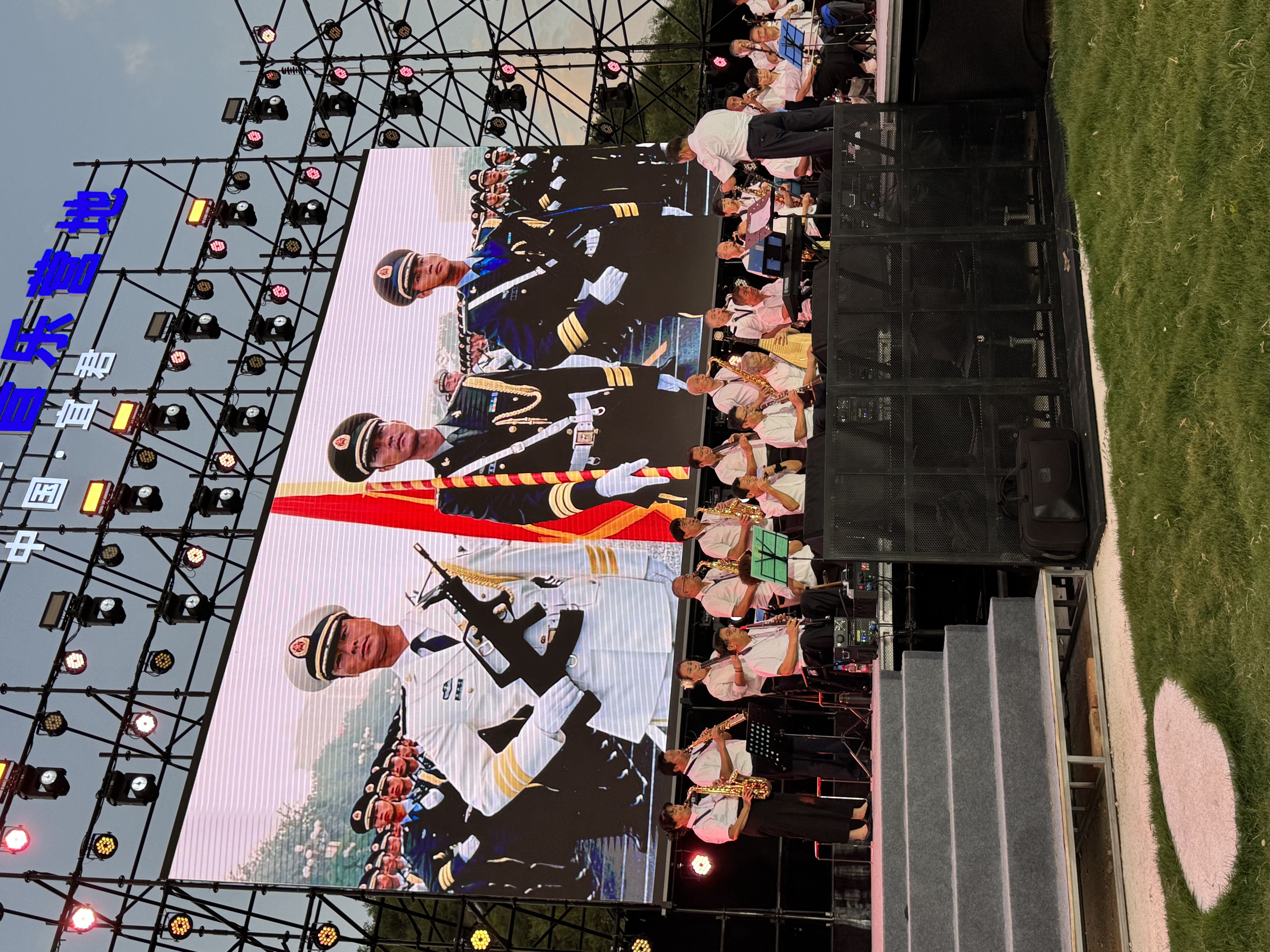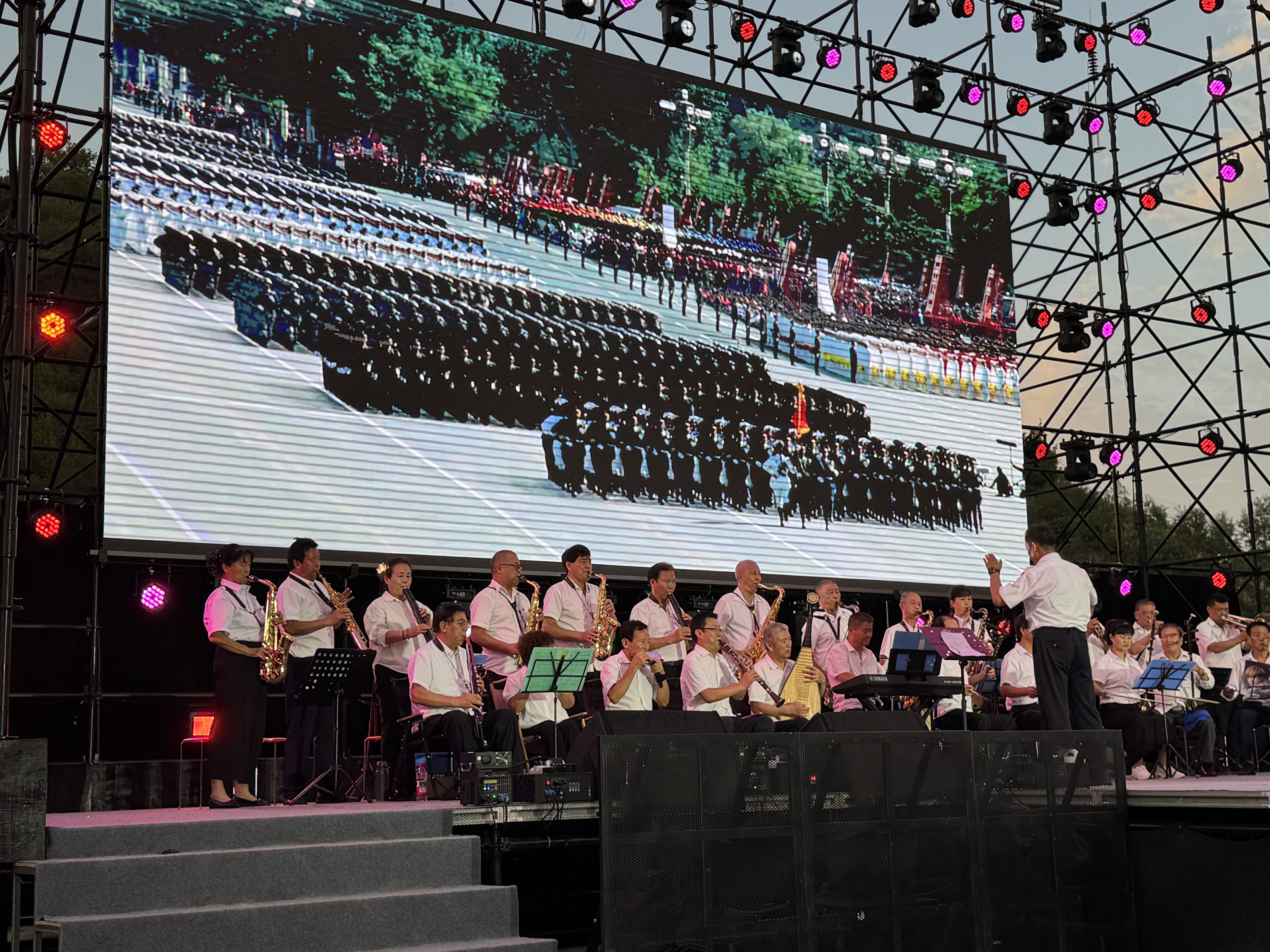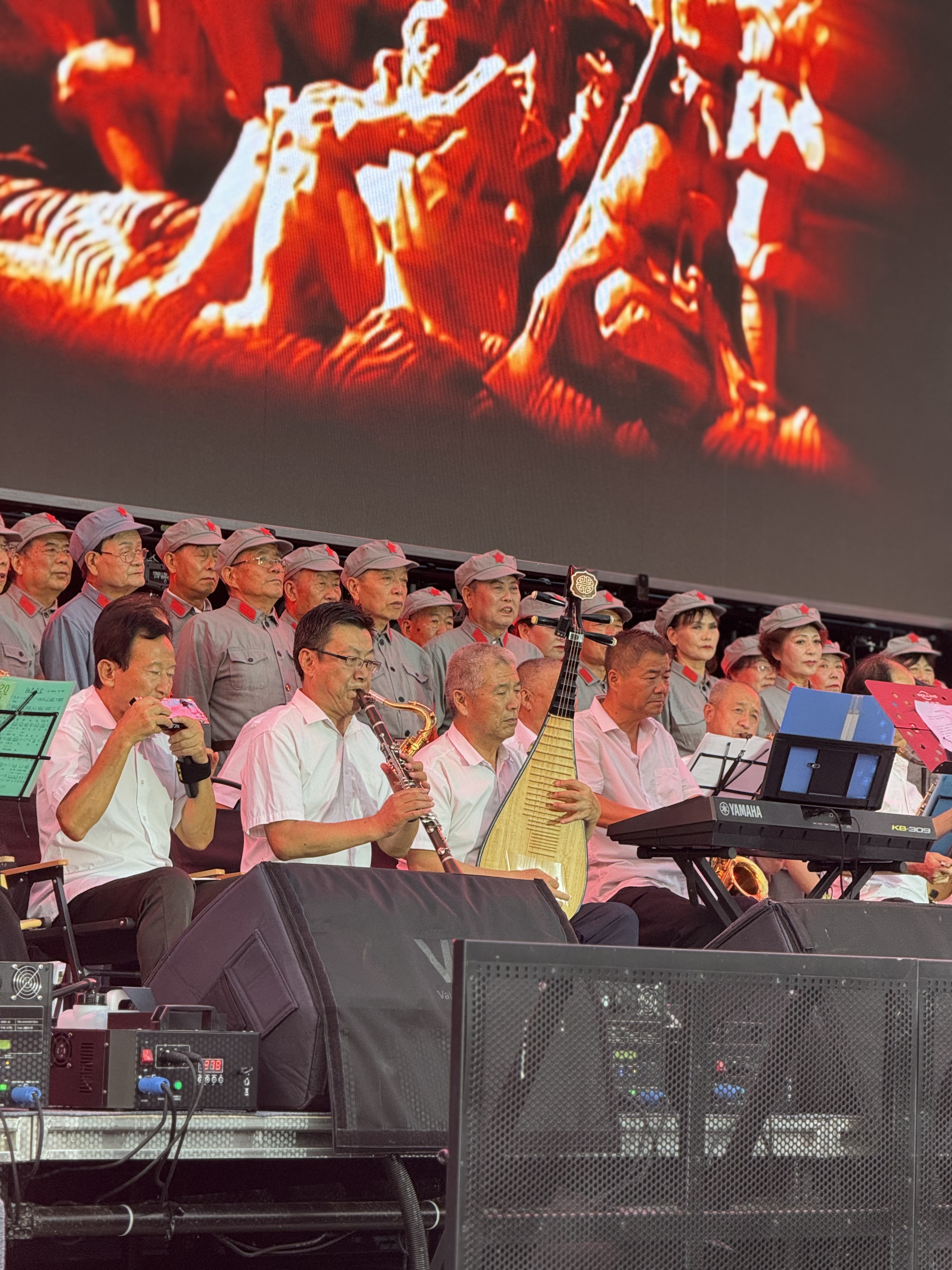 印象较深的是红歌连奏,《南泥湾》《浏阳河》等曲目演奏得流畅动人,现场不少观众跟着节奏轻和,氛围很融洽;秦腔《飘彩》展现了地方戏曲的独特韵味,伴舞配合默契;最后全体演职人员合唱《歌唱祖国》,场面整齐有力,感染力强。