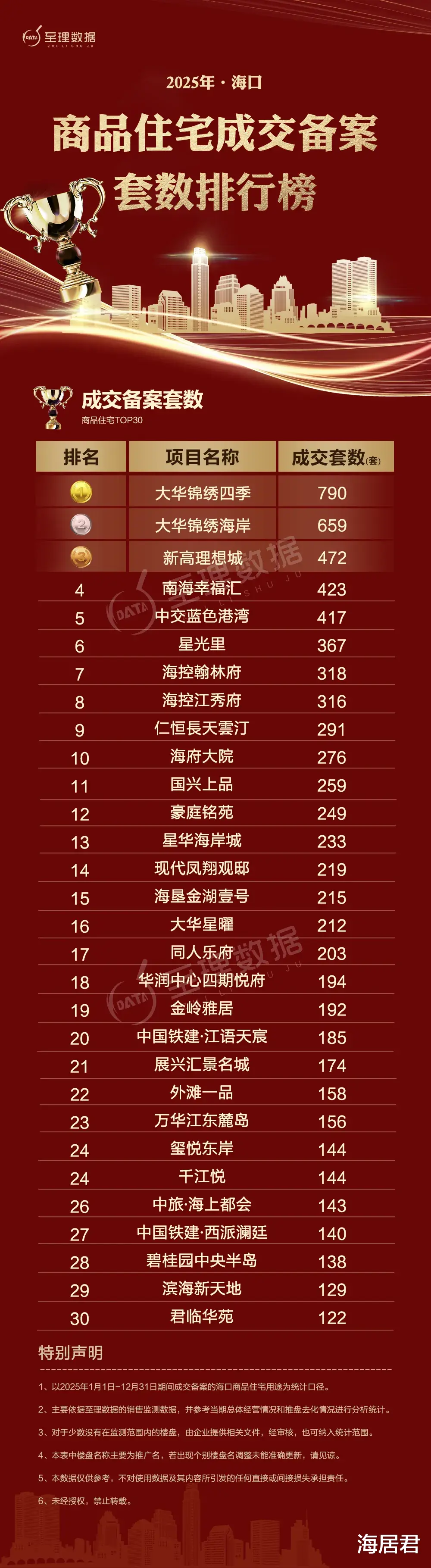 2025年海口商品住宅成交套数TOP30楼盘共成交7938套,大华集团旗下项目夺得冠亚军:大华锦绣四季成交790套、大华锦绣海岸成交659套,泰达地产开发的新高理想城成交472套摘得季军。